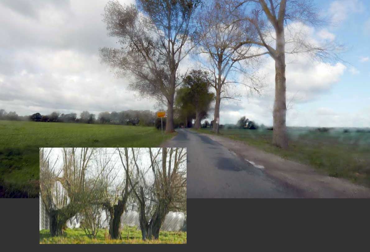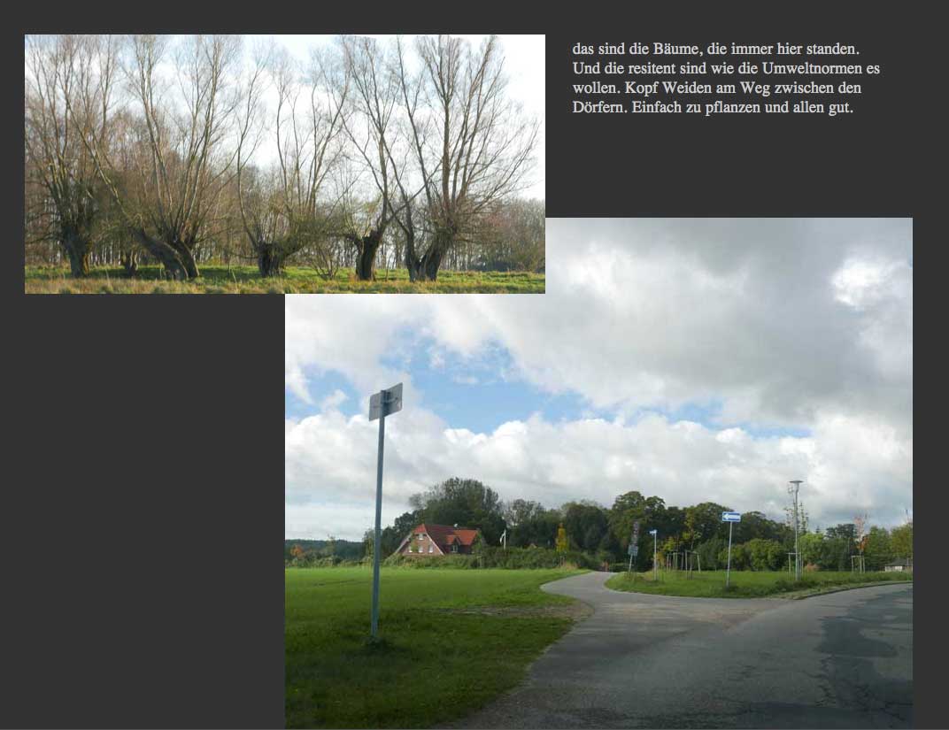 Das was als Pappel-Allee entfernt werden soll, noch mal in Frage gestellt, als das was da wirklich ist, als Hecken-Weg mit Eichen und Weiden plus Pappeln und so unter Schutz zu stellen sinnvoll zu ergänzen. Mit Weiden die da früher waren.