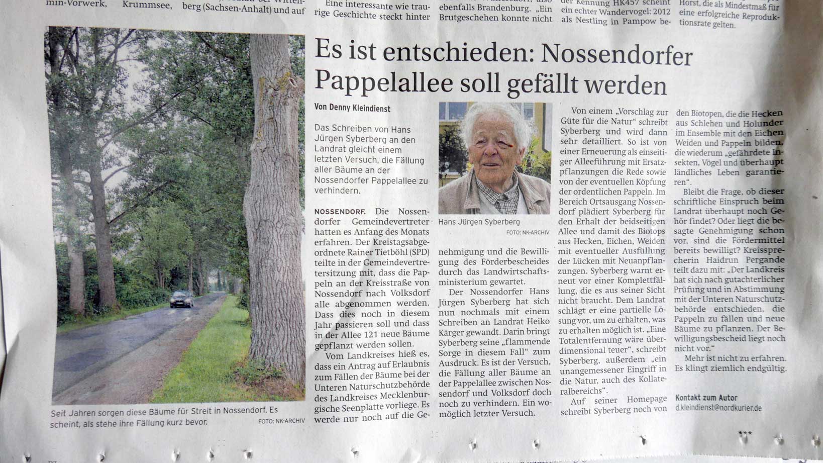Unser Brief an den Minister als Adressat einer Darstellung im Sinne der Artenvielfalt von Hecken und Biotopen von Eichen(5) und Weiden(3) mit den (im letzten Gutachten auf 10 Jahre als gefahrlos eingeordneten)Pappeln zusammen liegt nun dort vor. Und dies betrifft zumindest den Nossendorfer Teil der Allee bis zur Biegung der Strasse. R.Tietböhl als Hauptbetreiber der Fällungen wurde angeschrieben. Seltsamerweise verweist er uns / mich auf den Platz des Films und nimmt für sich in Anspruch die Ordnung des Landes(Landwirt). Das in Verkennung der öffentlichen Gelder und einer öffentlichen Strasse und des Anliegens also aller. Also ob es sich um einen Privatweg handle, mit öffentlichen Geldern. Und das mit leeren Kassen der Gemeinde und in Zeiten grosser Aufmerksamkeiten für Verluste der Natur. Und das sind hier Insekten(Bienen und nicht nur die), Vogelsterben, Artenminderungen(Hecken).