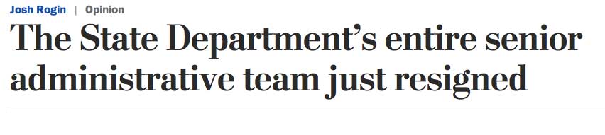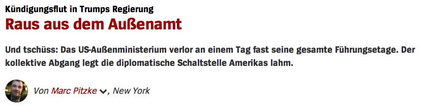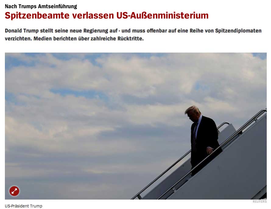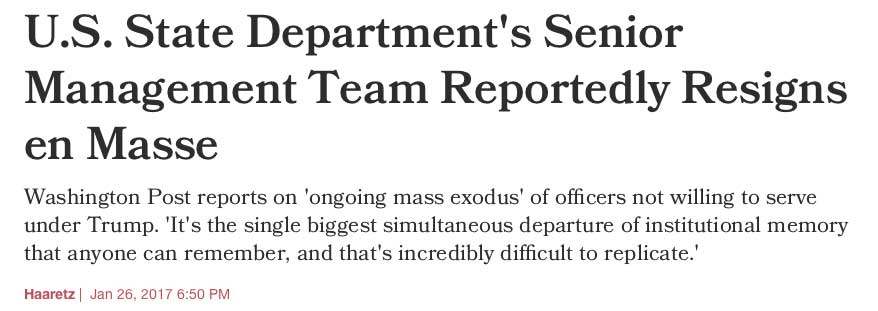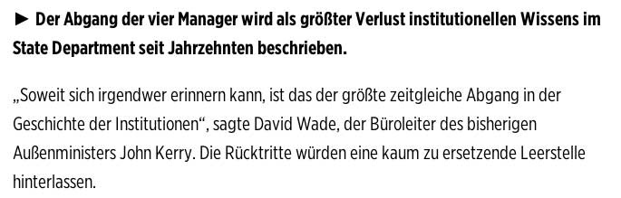 Damit verlor das State Department - eine der komplexesten Behörden der Welt - an einem Tag fast seine komplette Führungsetage. Es war der Höhepunkt eines beispiellosen Phänomens: der mal freiwillige, mal erzwungene kollektive Exodus von Regierungsbeamten unter dem neuen US-Präsidenten.