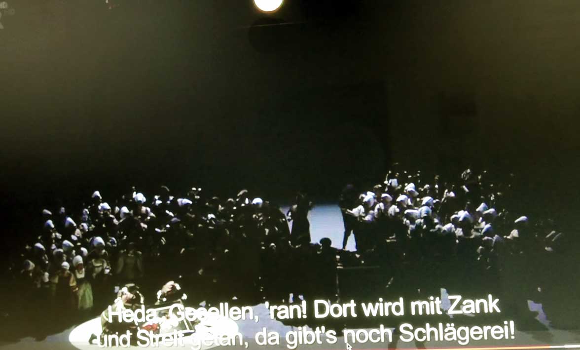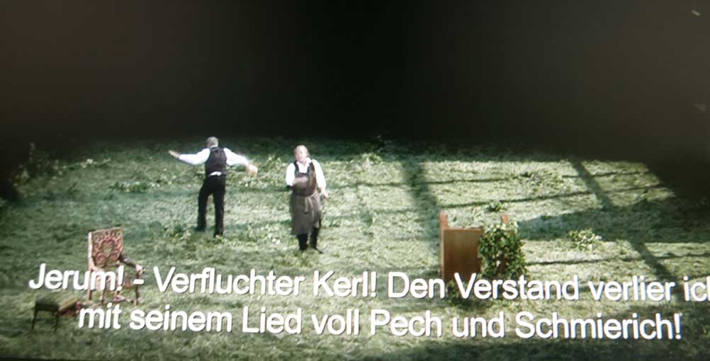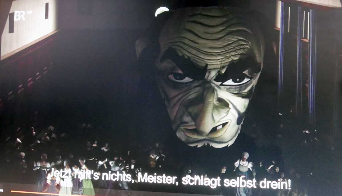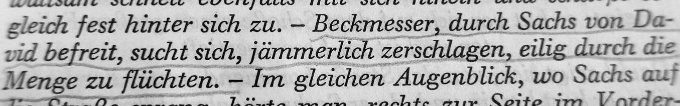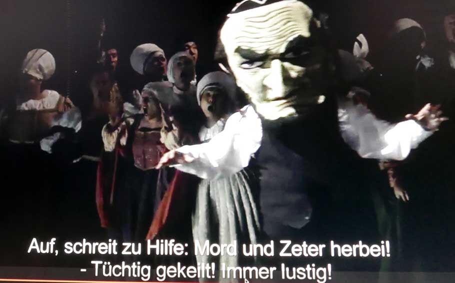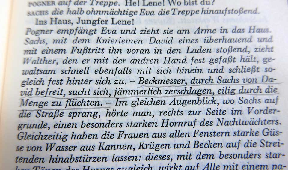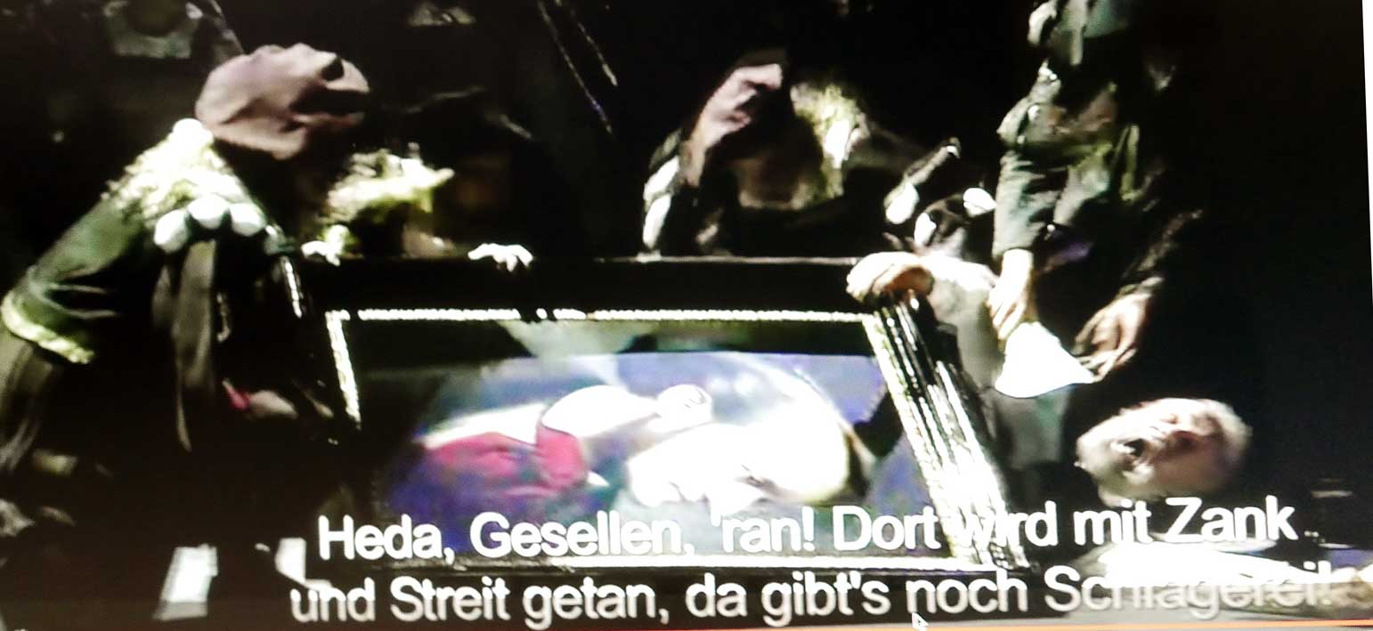 das geht solange mit Witz und immer beschädigtem Ton des Beckmesser, bis die Leute aufwachen und toben, zu fragen, was da los ist.