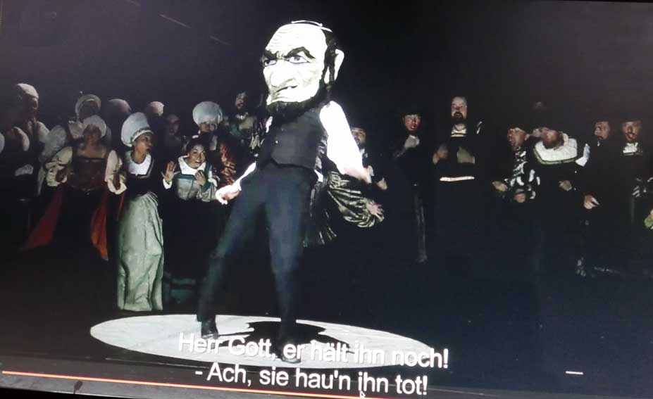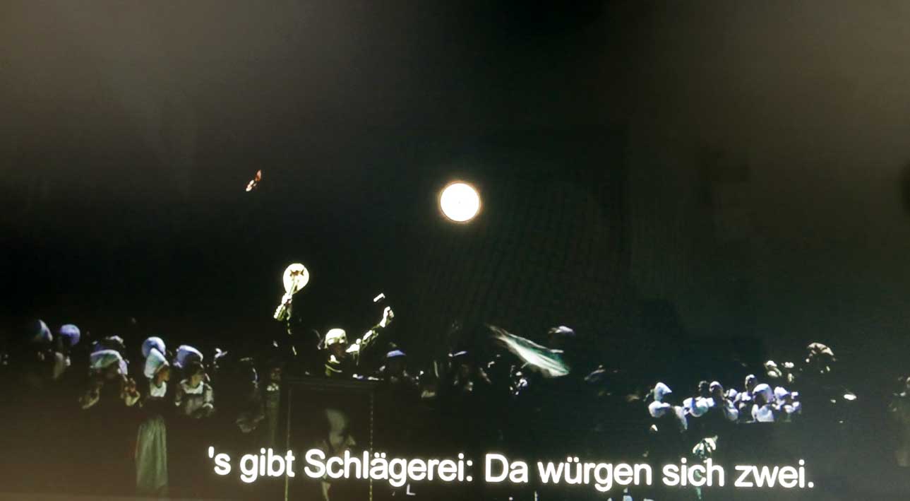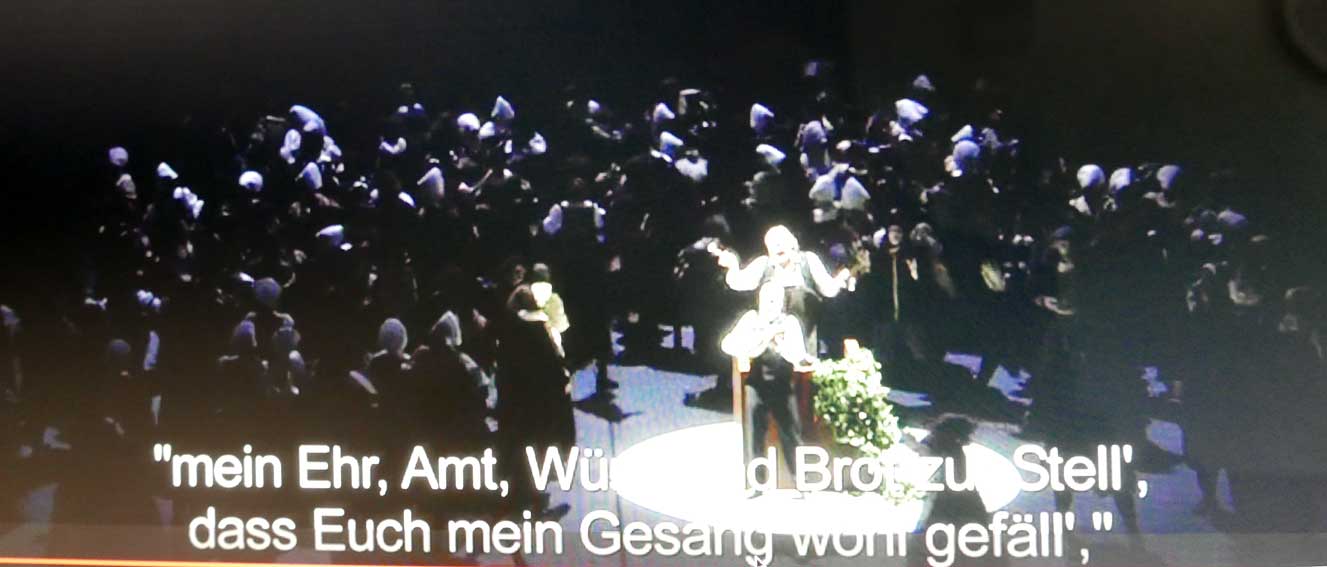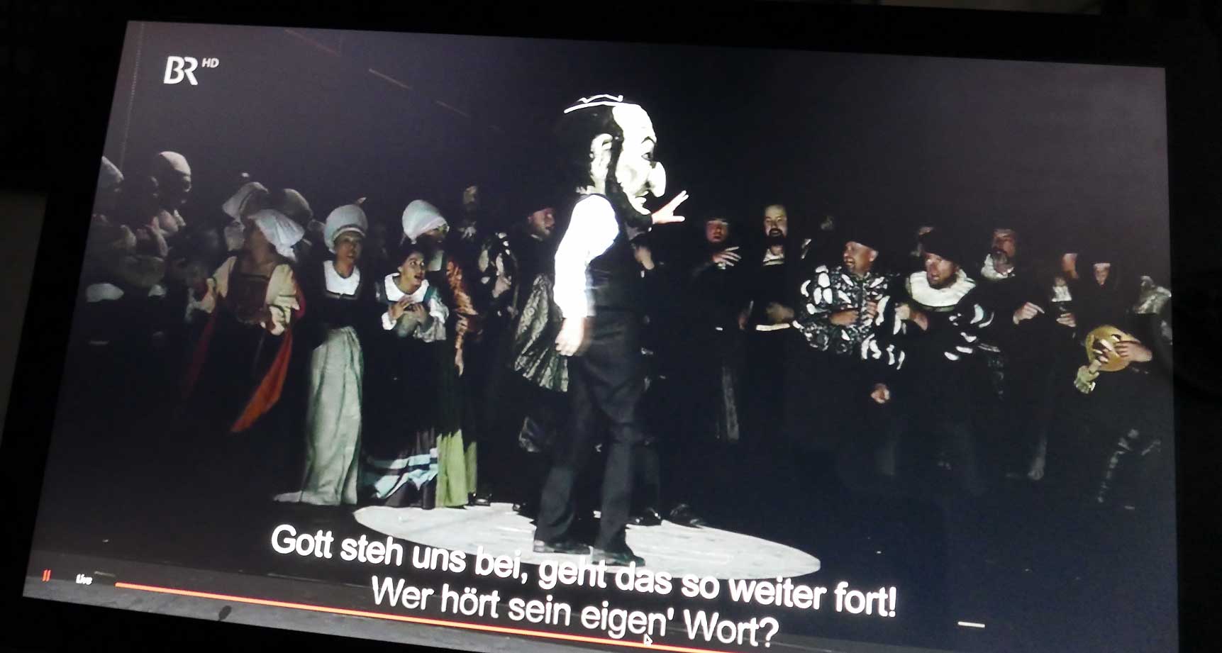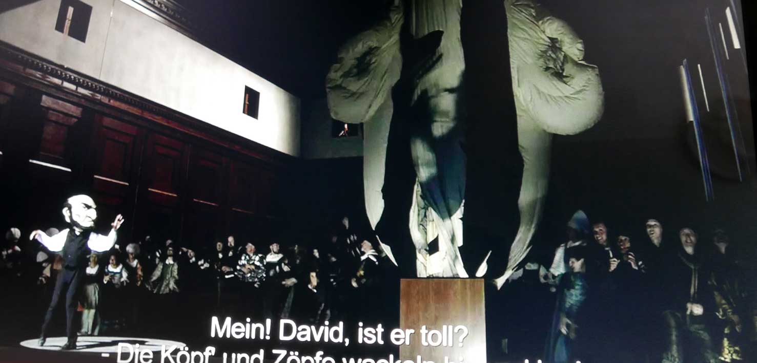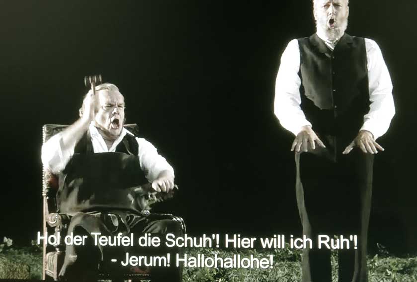das geht solange mit Witz und immer beschädigtem Ton des Beckmesser, bis die Leute aufwachen und toben, zu fragen, was da los ist.