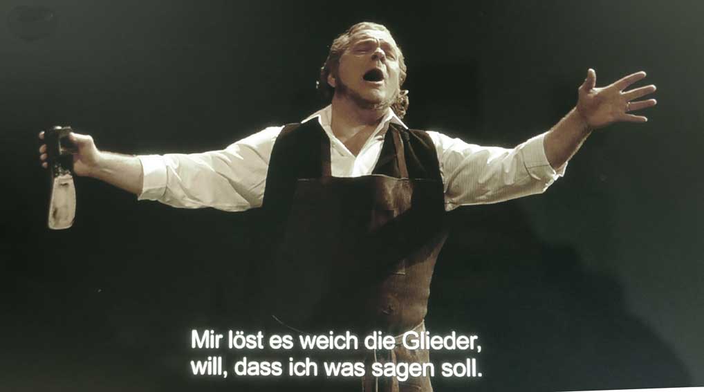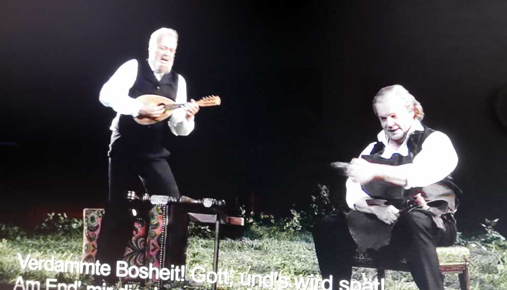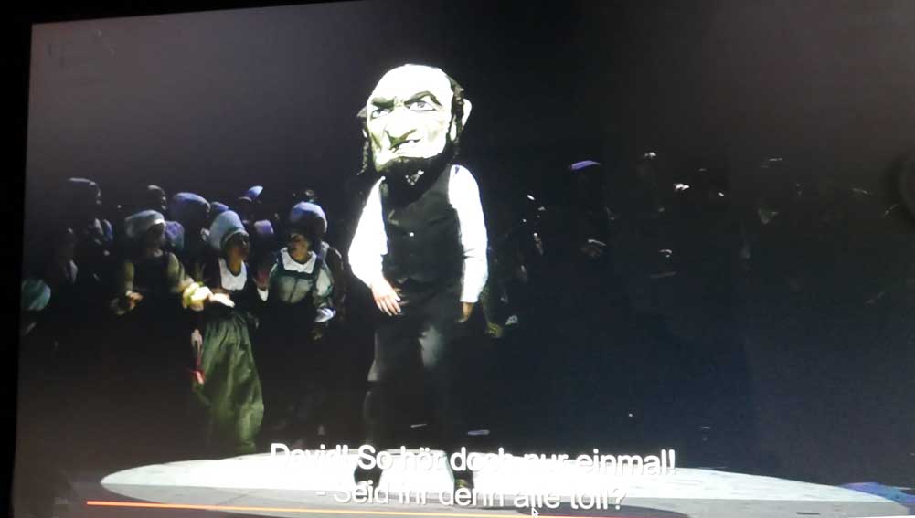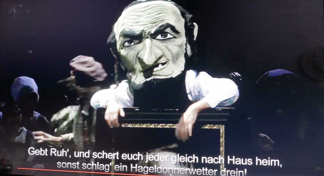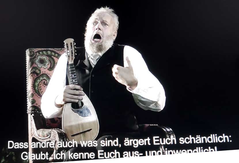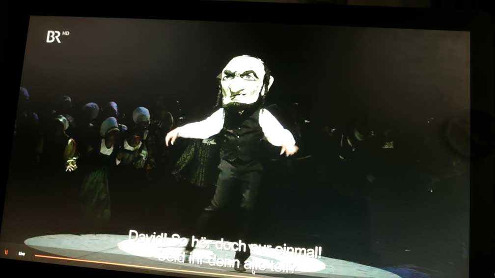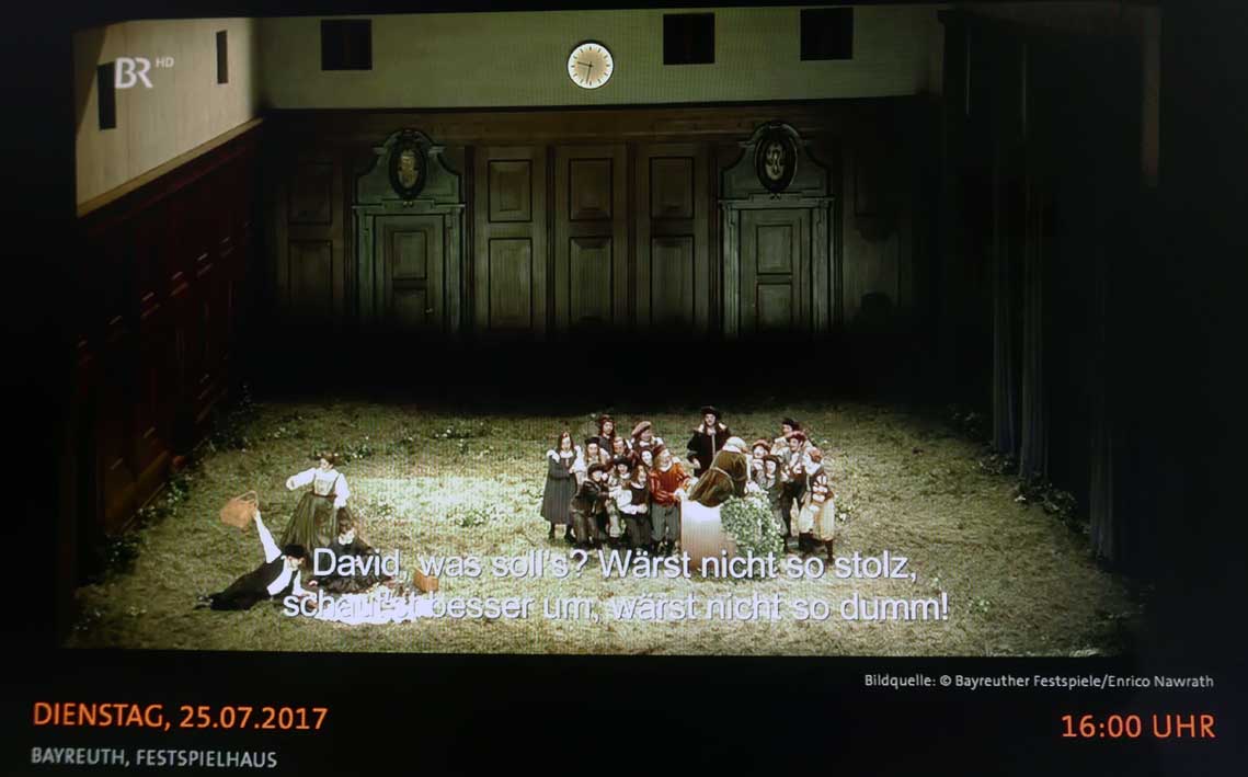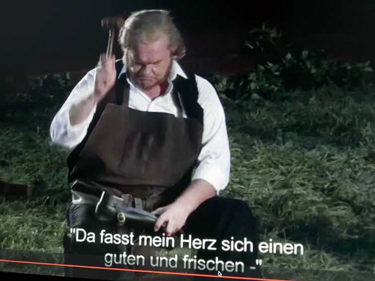 das geht solange mit Witz und immer beschädigtem Ton des Beckmesser, bis die Leute aufwachen und toben, zu fragen, was da los ist.