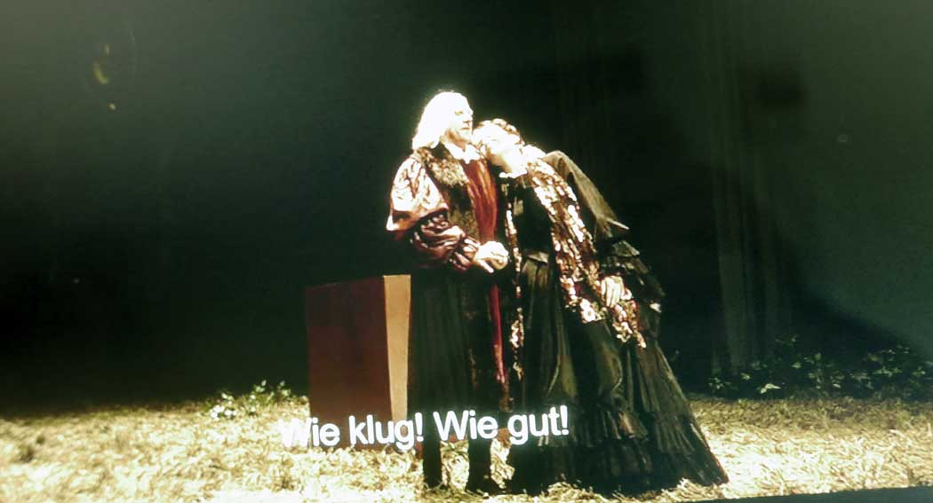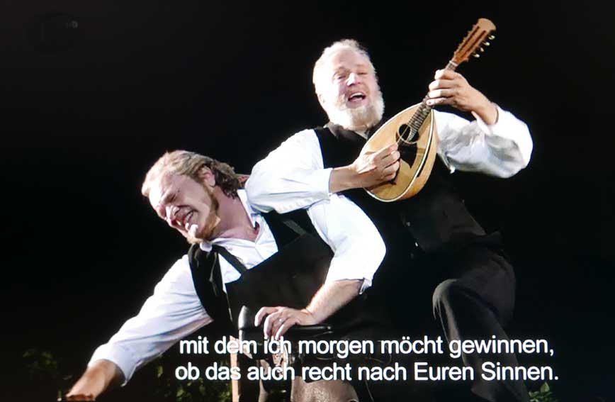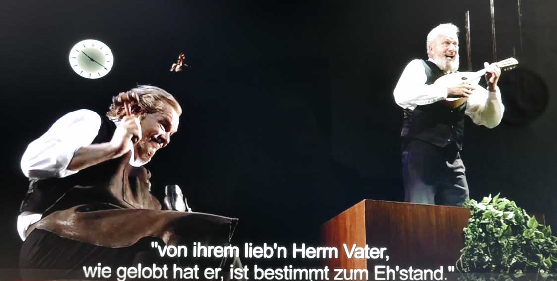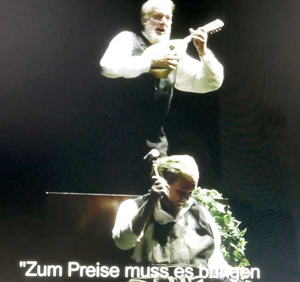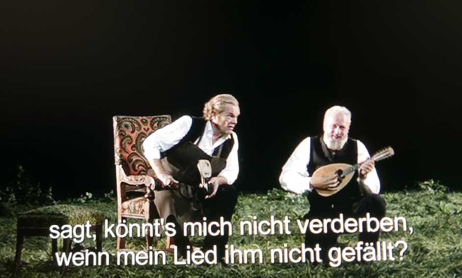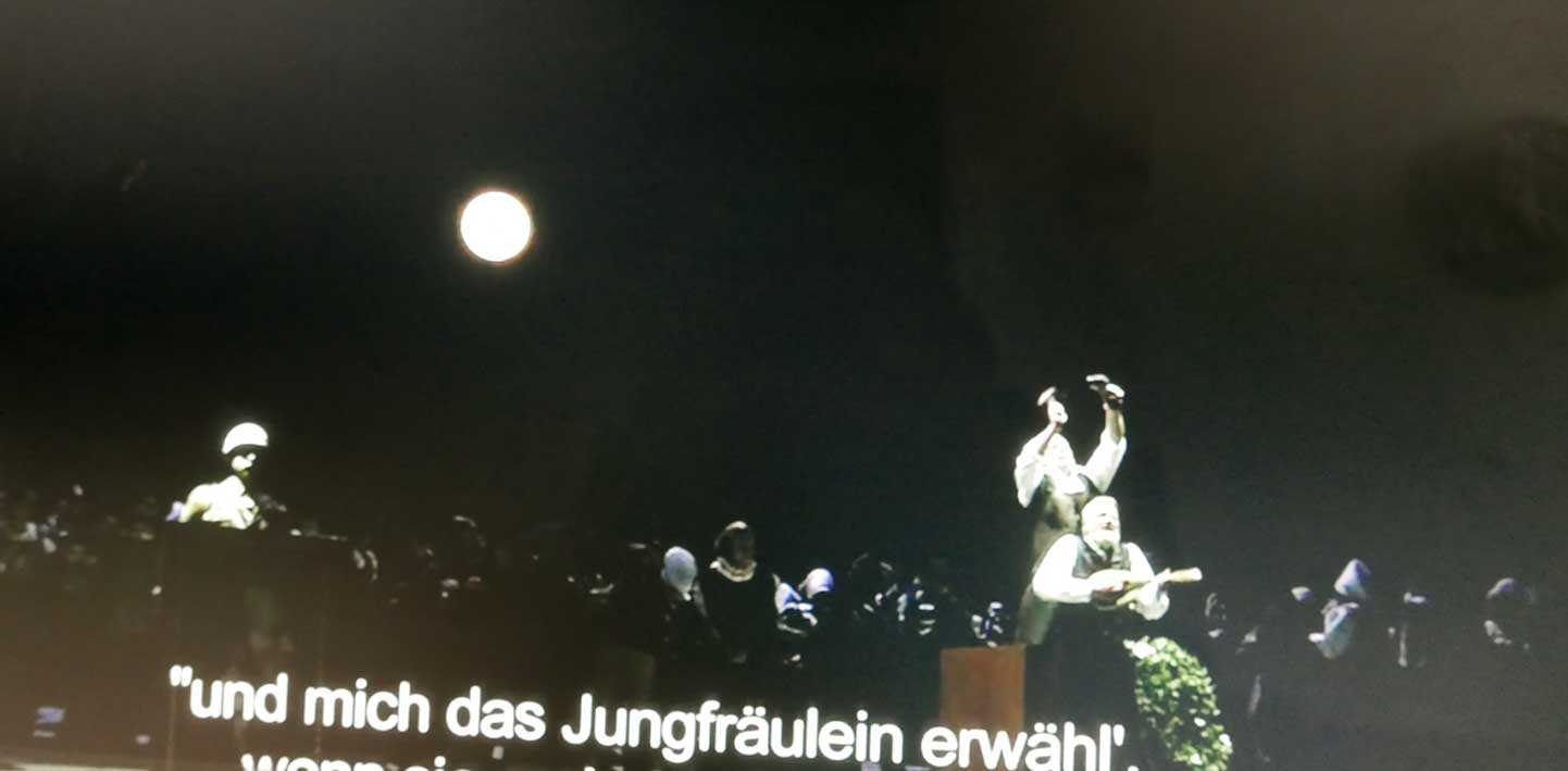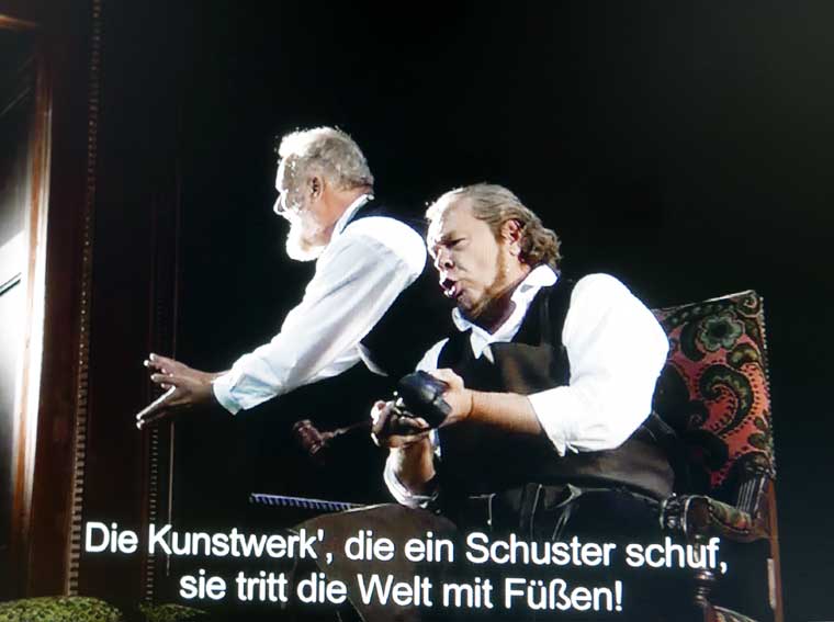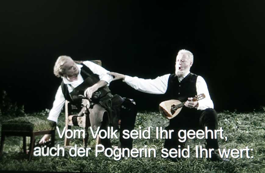 Da auch noch David und Lena im Spiel sind mit Verkleidungsszenen und Verwechslunegen, wird die Bühne und Musik aufgeladen mit Werben und Gunst, mit Lieben und Kunst, denn nur der darf die Eve nach Hause frühren, der im Singen siegt. Da ausgerechnet Beckmesser die Regeln verwaltet, wird er, Verlachte, wichtig.