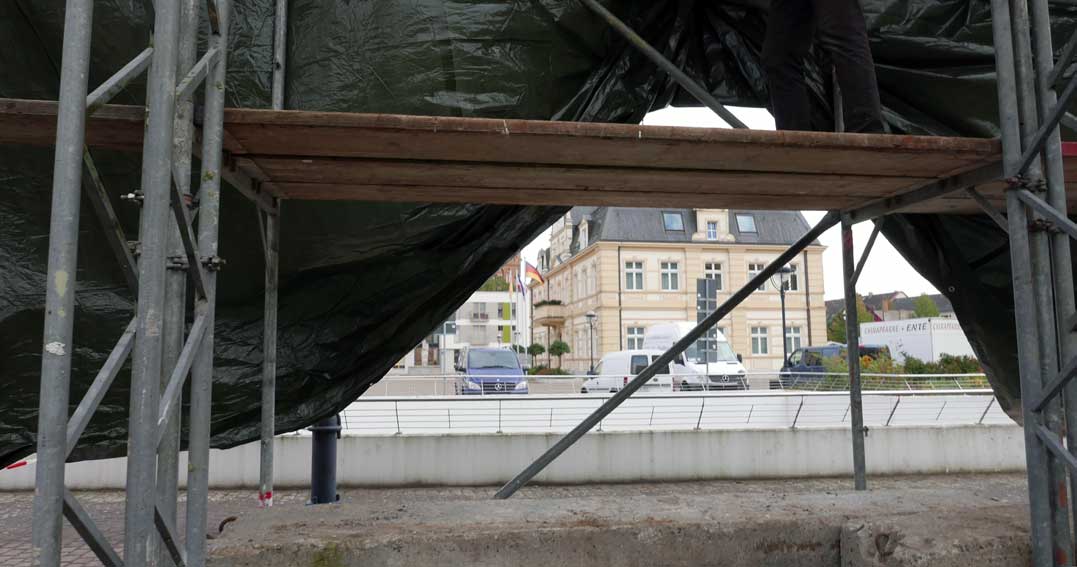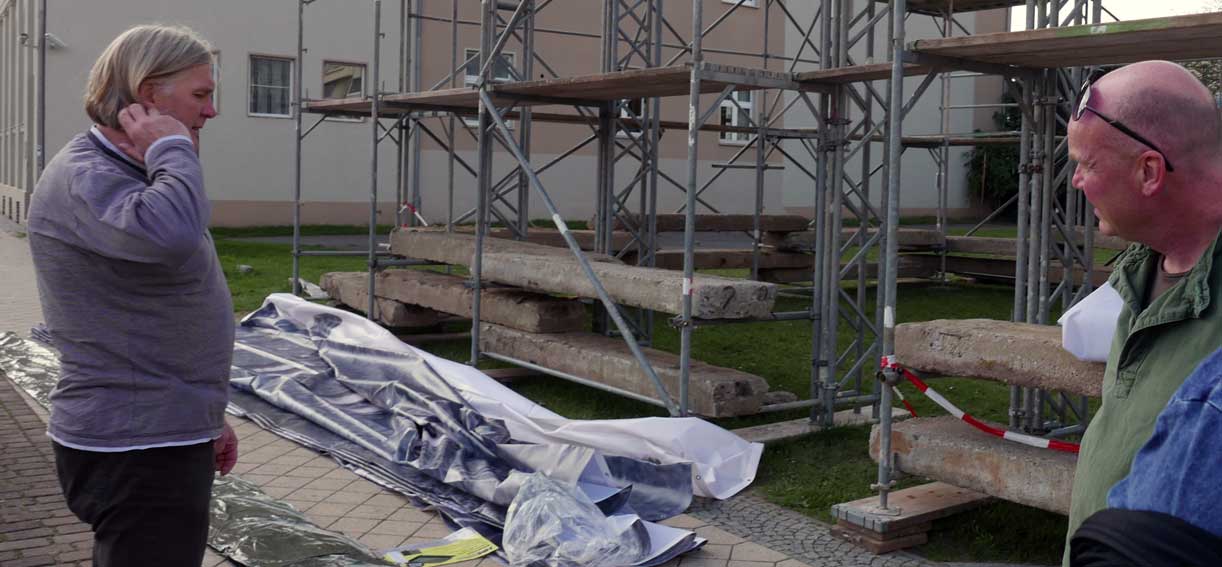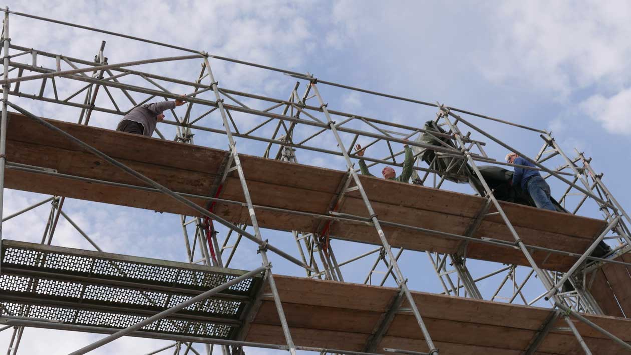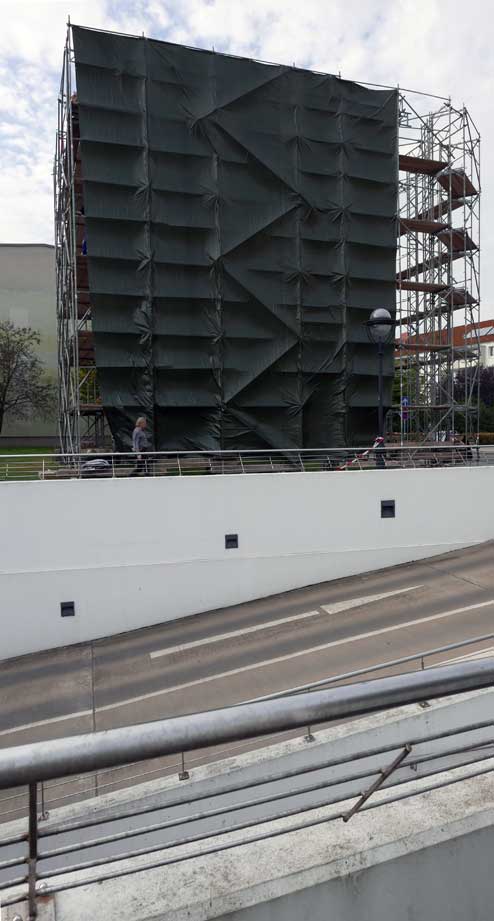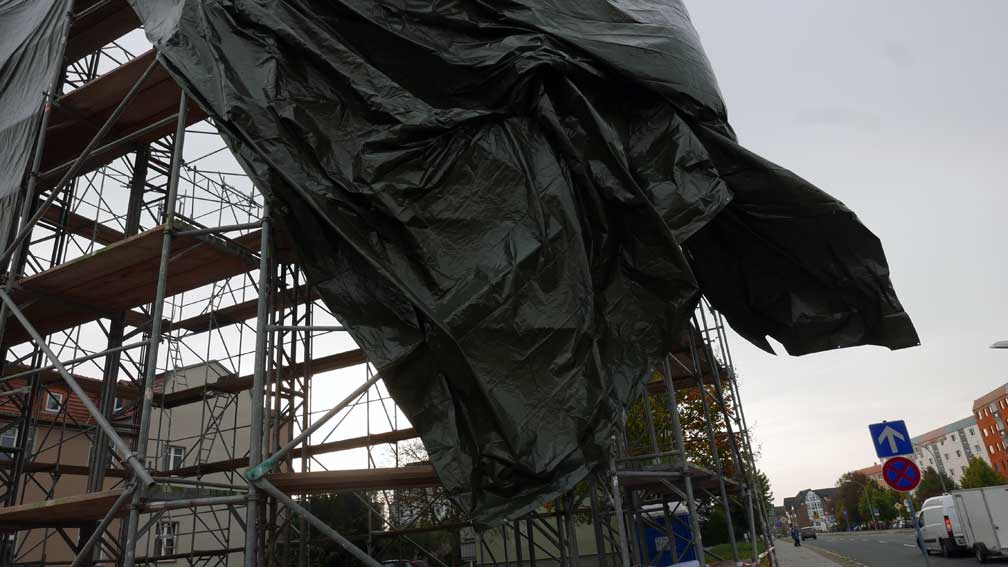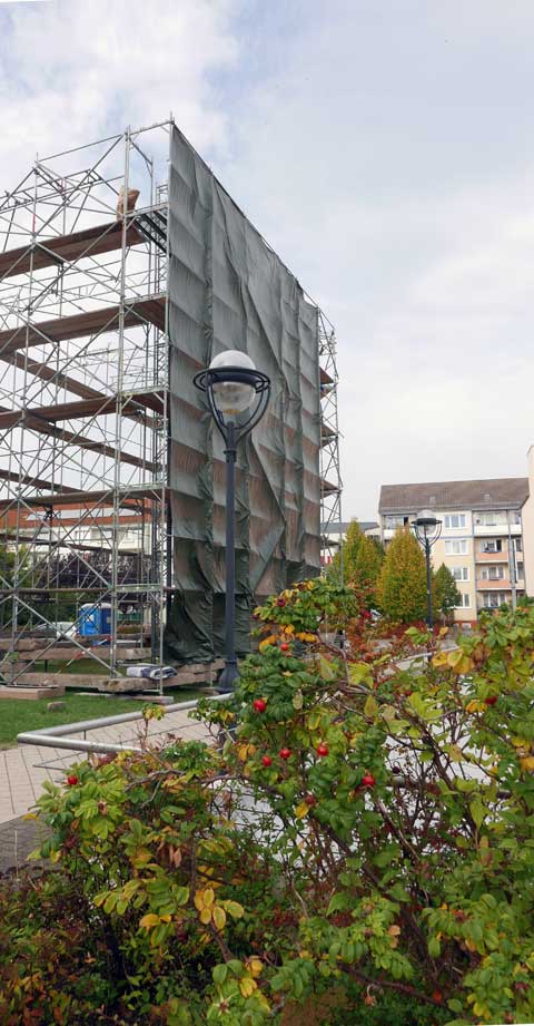 das fertige Gerüst hindurchzuschauen, mit Beton platten beschwert und die ausgedrückte Hülle des Hauses lagen am Fuss des Gehäuses frisch angekommen aus Rostock