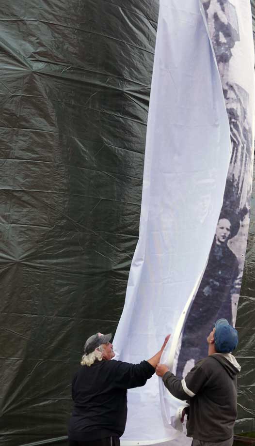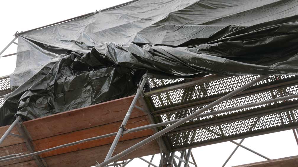 Plane suchen, finden, Leute ranholen, von oben zuerst der Untergrund die Plane, ob sie reicht, wie es fällt