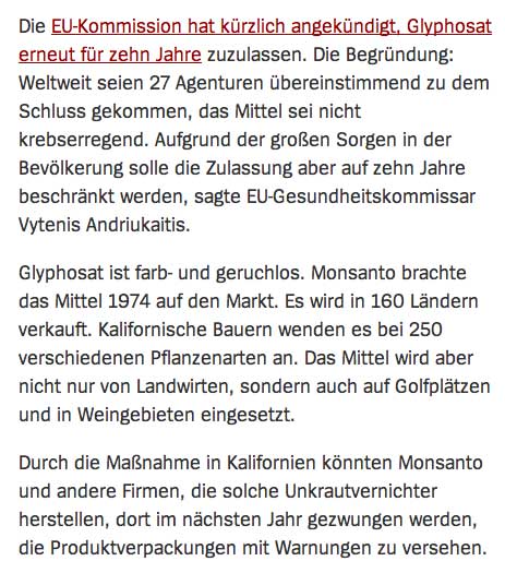 wer fragt die Regierenden jetzt vor der Wahl nach ihrem Voturm für oder gegen Klyphosat. Das Leben auf dem Lande und nach Vögeln, die sterbenden und nach den Feldern, die industrialiserten des in den Krankenbetten des Endes unserer Kultur. Ganz einfach: wie verhälst äfte machen, die damit ihre Milliarden -Geschäfte machen. Damit wir wissen, wen wir wählen dürfen, wer für das Lebens ist und wer für den Tod des Planeten. Was die USA nicht mehr verkaufen dürfen jetzt uns angedreht zu 65 Mrd? und das geht nur mit insgeh. Zusage der Verkaufsabsichgerungen.