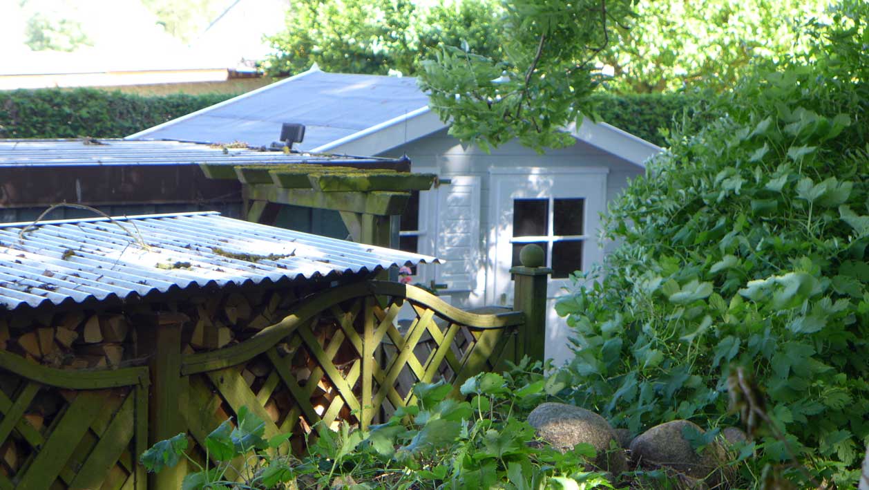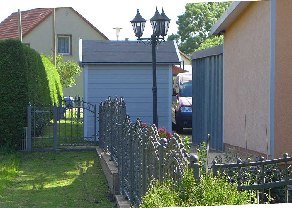 dann Zaun mit Geräteschuppen zur Pflege für eine gepflasterte Garagen Auffahrt