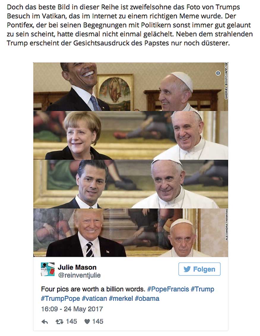 wie dieses Grinsen neben dem Ernst des Papstes als Maske zustande kam, besitzt nun das vatikanische Archiv. Vor dem Auftritt Obamas in Berlin war es nur dort und kurz zu sehen.