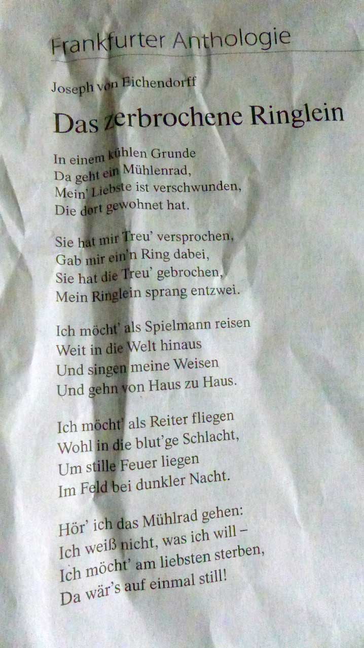 was wärs für ein Verbrechen dieses Gedicht zu ehren im Schloss Berlins von Eichendorff aus Schlesien, gedenkend auf stiller Wand woher es kam. Jetzt mit poln. Postkarten von den Polen selbst gedruckt. Wie tragend alles wenn nicht zusammen.
