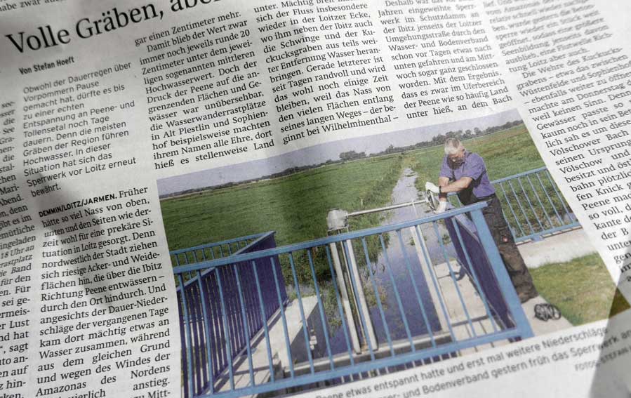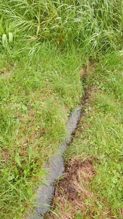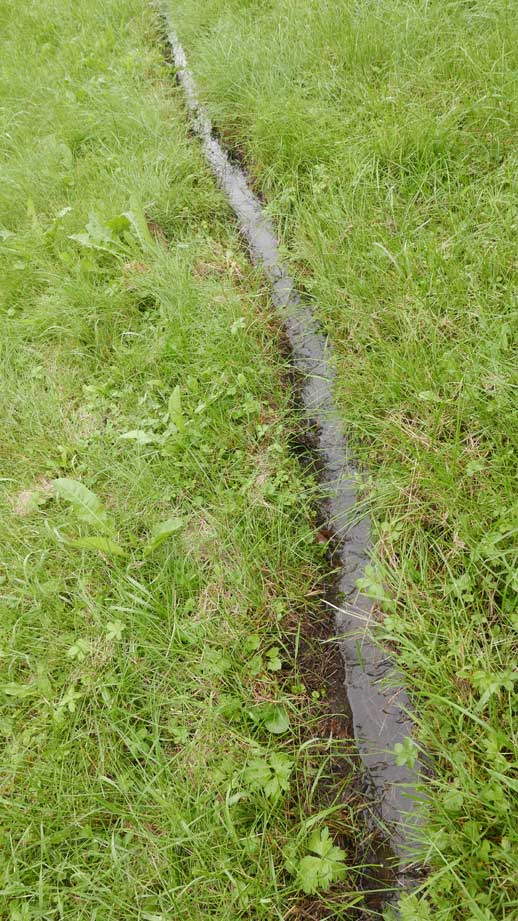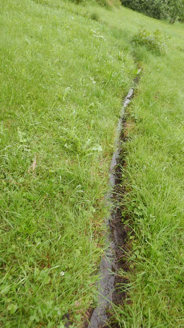 dies Rohr und Altlast der LPG anstelle des historischen Graben nur hier im Ort damals gegen die Gülle der LPG gelegt ist heute obsolet. Und sehr nachteilig für das Regen-Wasser das abfliessen will. Denn es ist geschlossen. Un so zogen wir Rinnen und Gruben, einen Teich zu Auffangen der Überschwenmungen. Im Park und Keller.