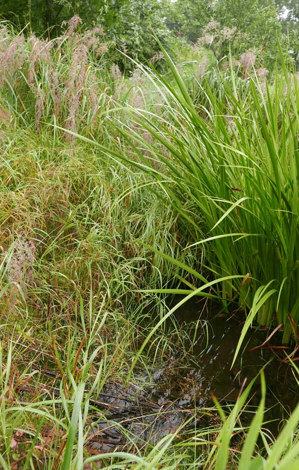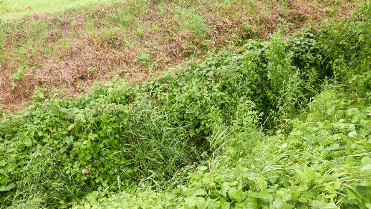 der alte Graben aber vor und nach dem Rohr ist leer und verkrautet, ein kleines Rinnsal selbst wenn sonst überall die Gräben voll sind im Sommer des Hochwassers wie jetzt