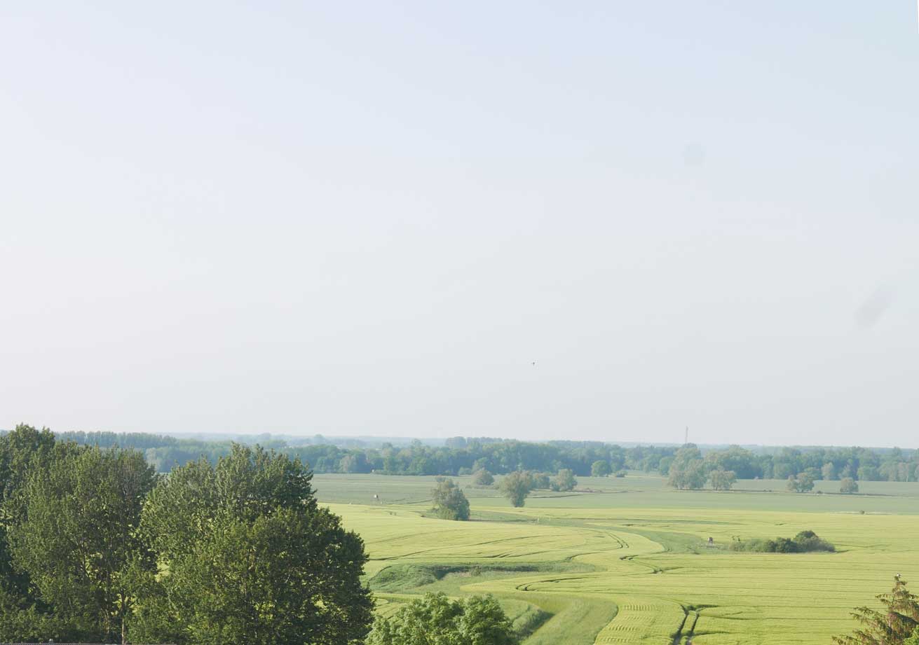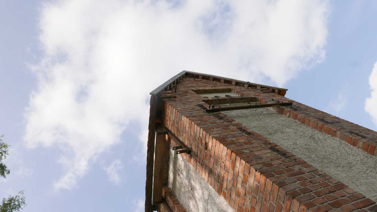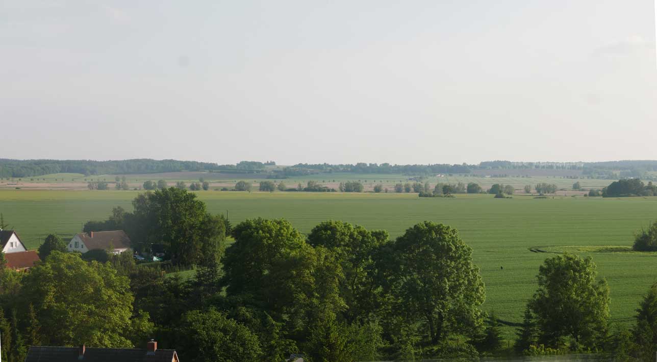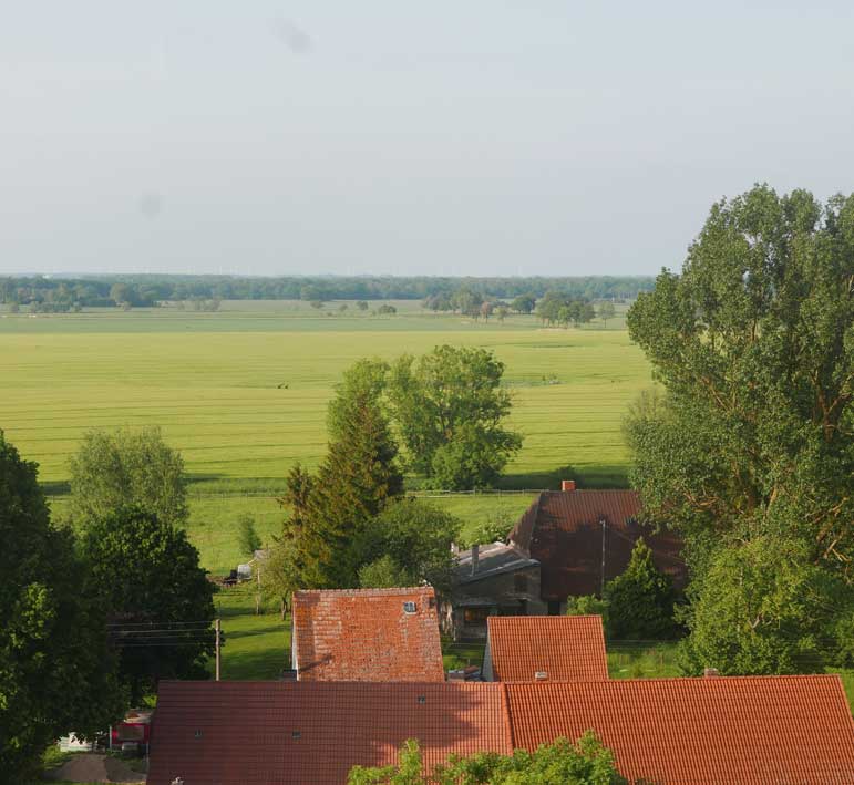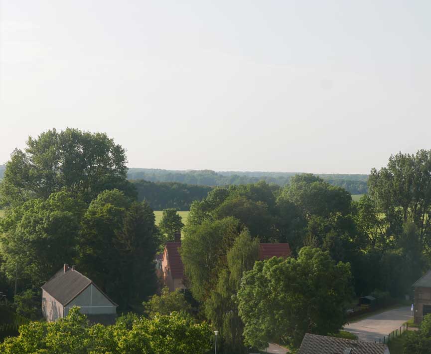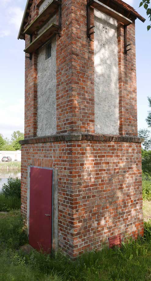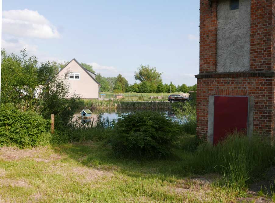 ein Teich ohne die Ställe und Scheunen dahinter, aber gerettet der Turm an seinem Ufer.