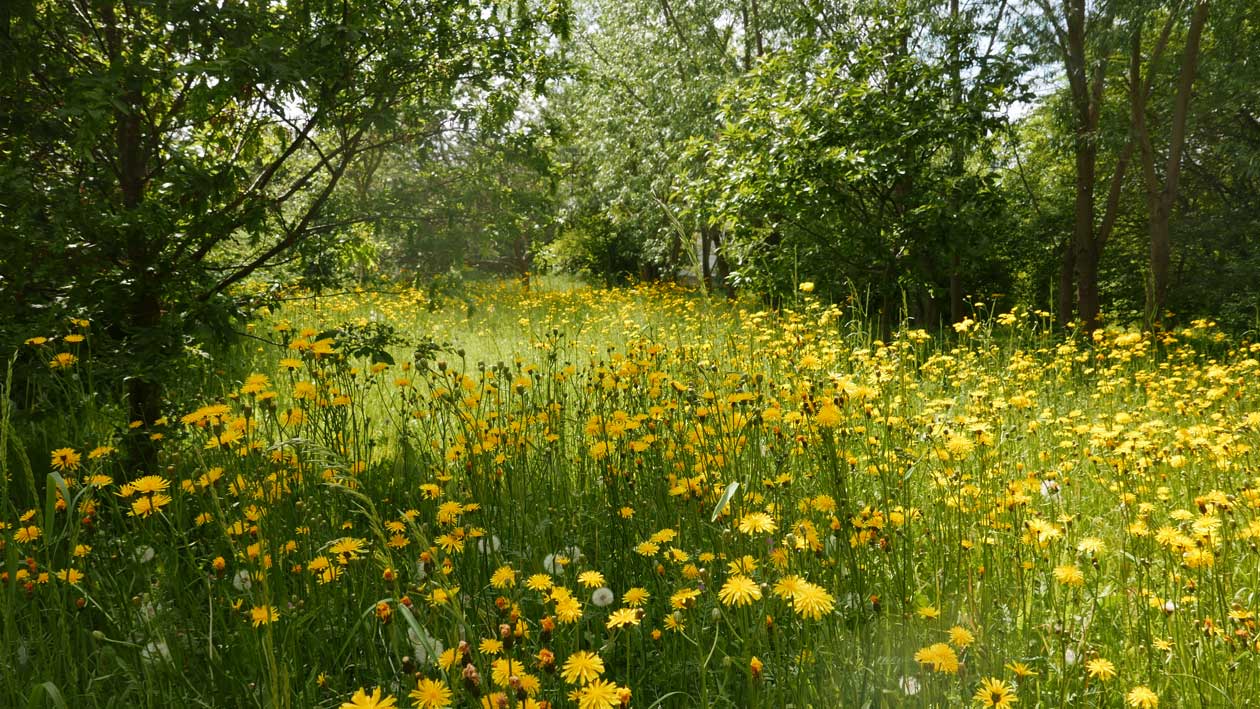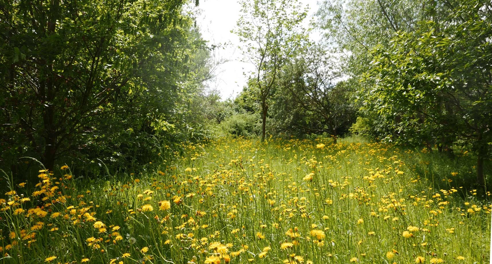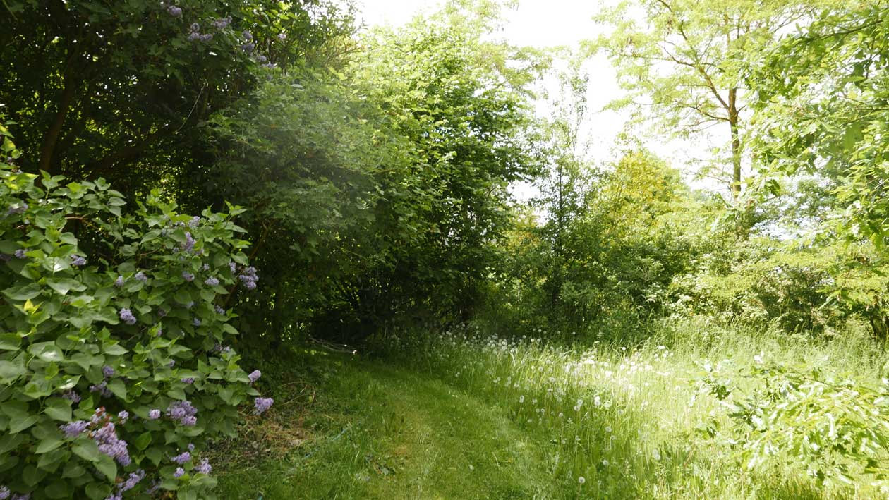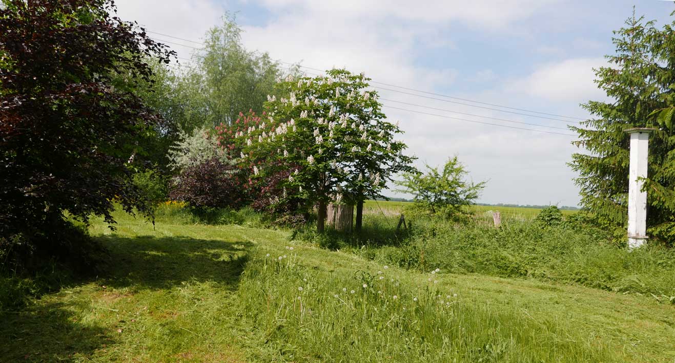 der Feldweg am Graben wieder frei aber wächst zu im Sommer. Hinten der Wald lockt den Wanderer umsonst. Einmal gab es erfreuliche Blumensaat für die Bienen.