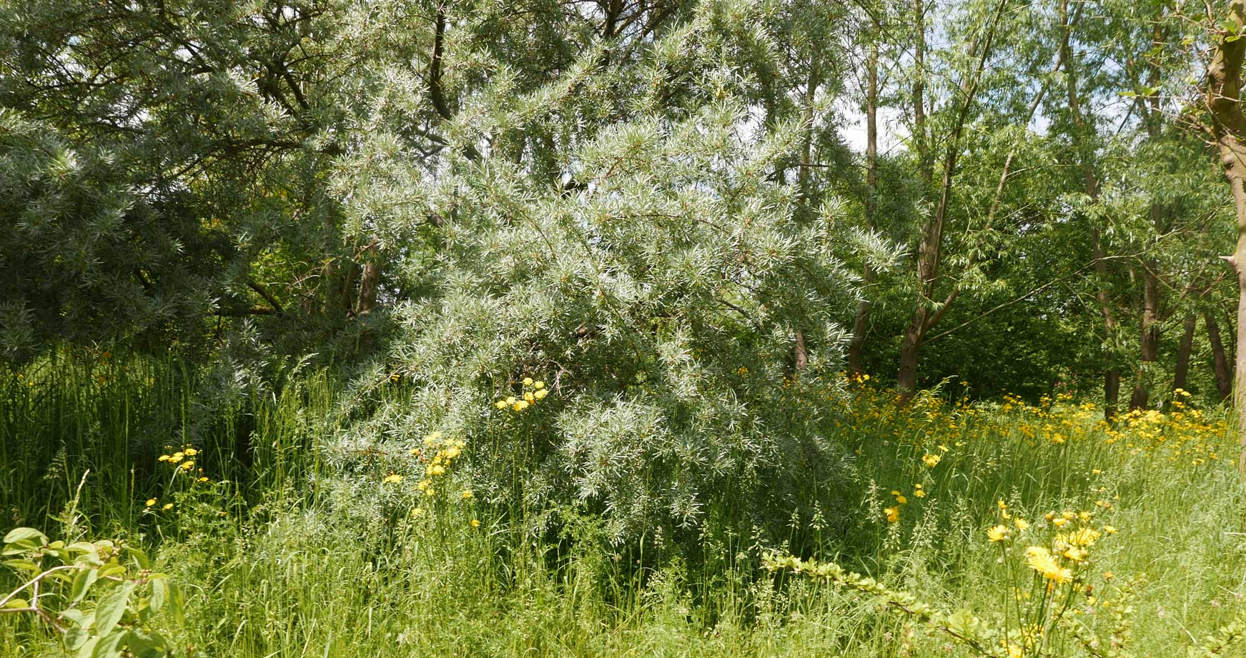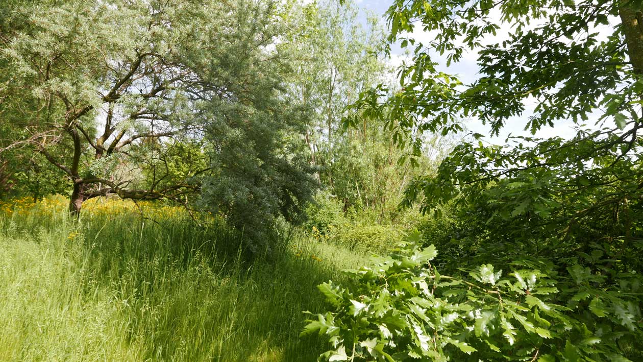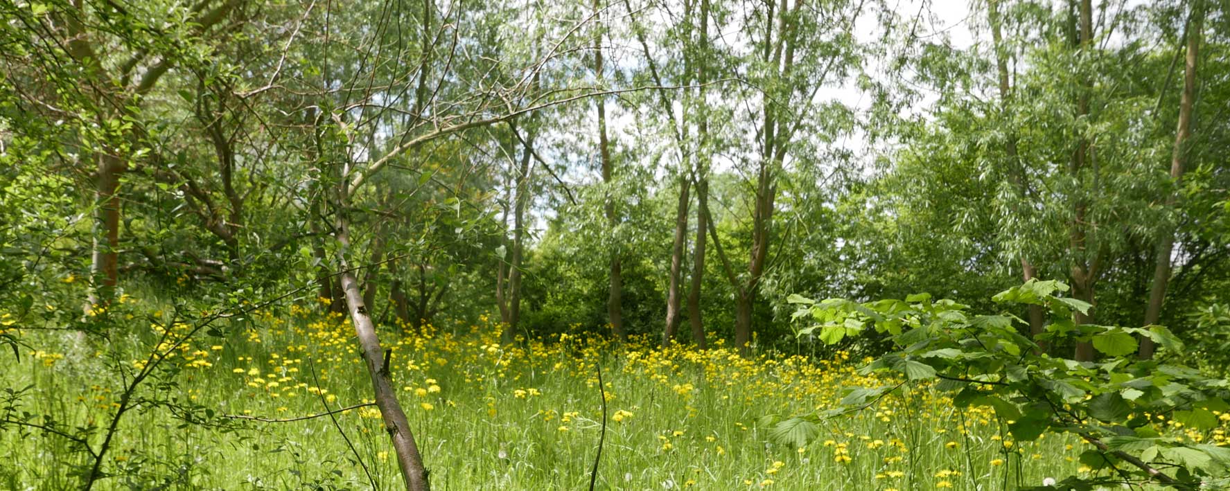 der Feldweg am Graben wieder frei aber wächst zu im Sommer. Hinten der Wald lockt den Wanderer umsonst. Einmal gab es erfreuliche Blumensaat für die Bienen.