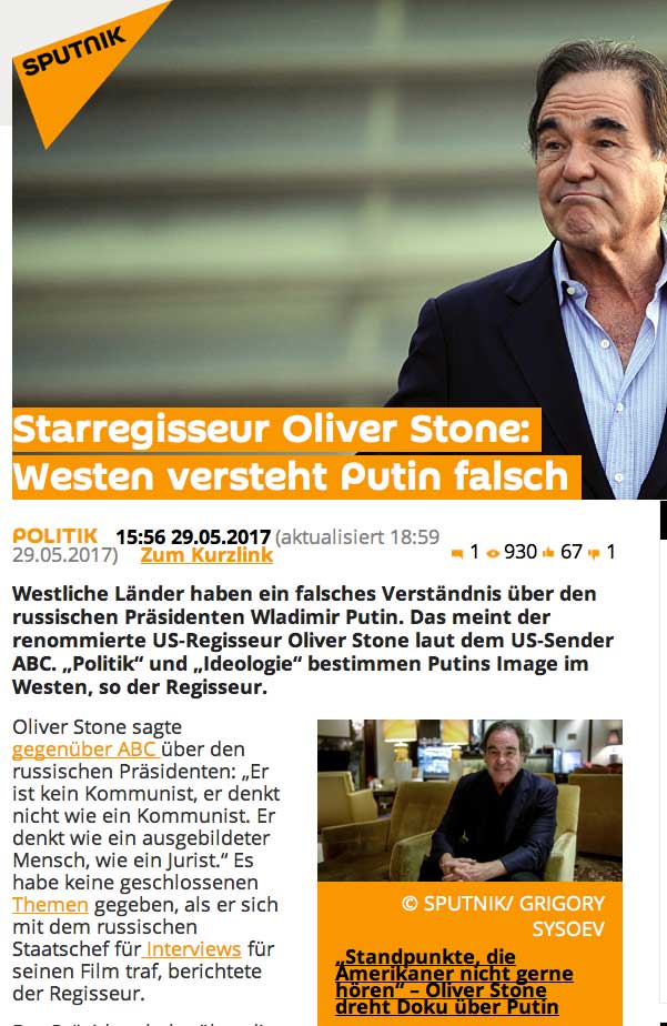 Der Präsident habe über die Interessen Russlands in der Welt gesprochen, bei denen es nicht um ein Imperium oder eine Erweiterung, Aggression oder die Rückkehr zur Vergangenheit gehe. Stone ist den eigenen Worten zufolge sehr besorgt über die Schwankungen in den Beziehungen zwischen Russland und den USA.