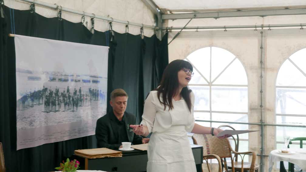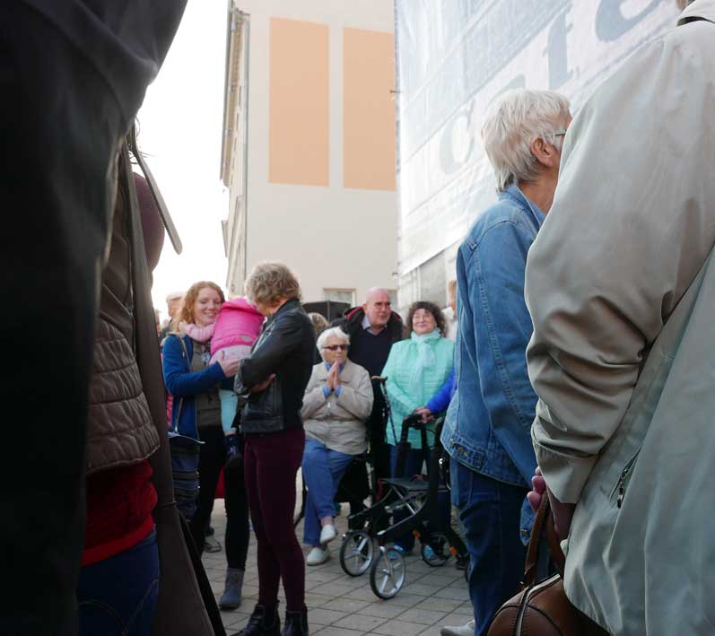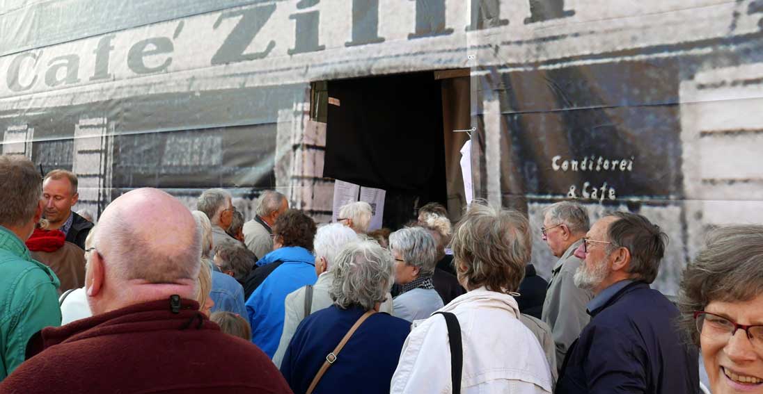 und nun stehen da die Menschen vor der Tür und wollen in ein Haus, das kein Haus ist und in ein Cafe, wie es dransteht, das kein Cafe ist, wie wir Cafes kennen.