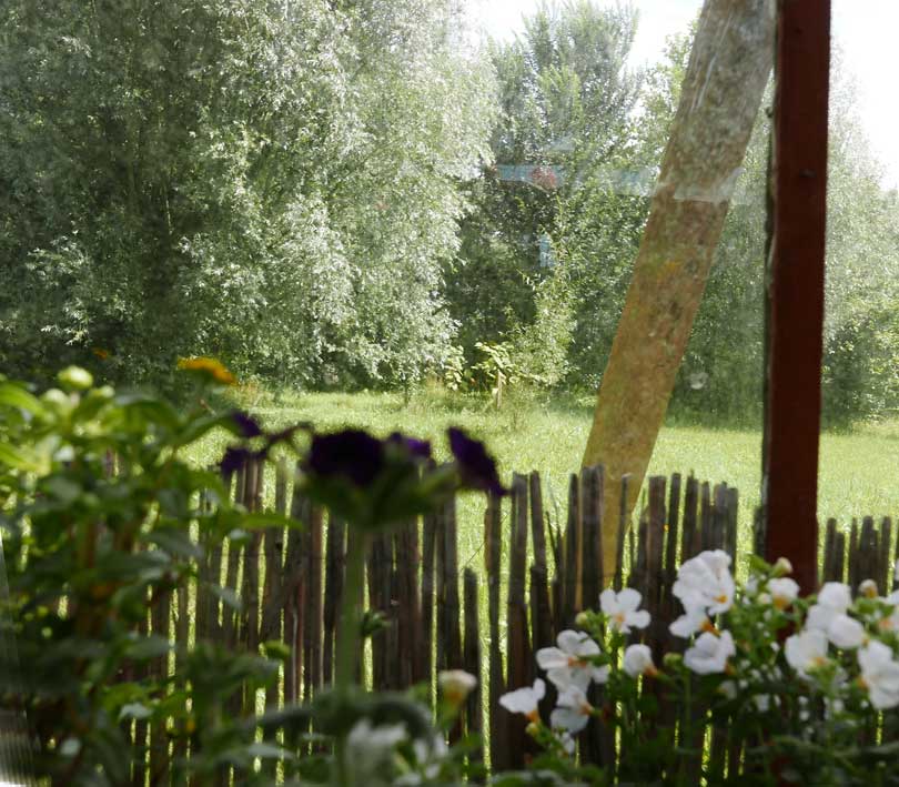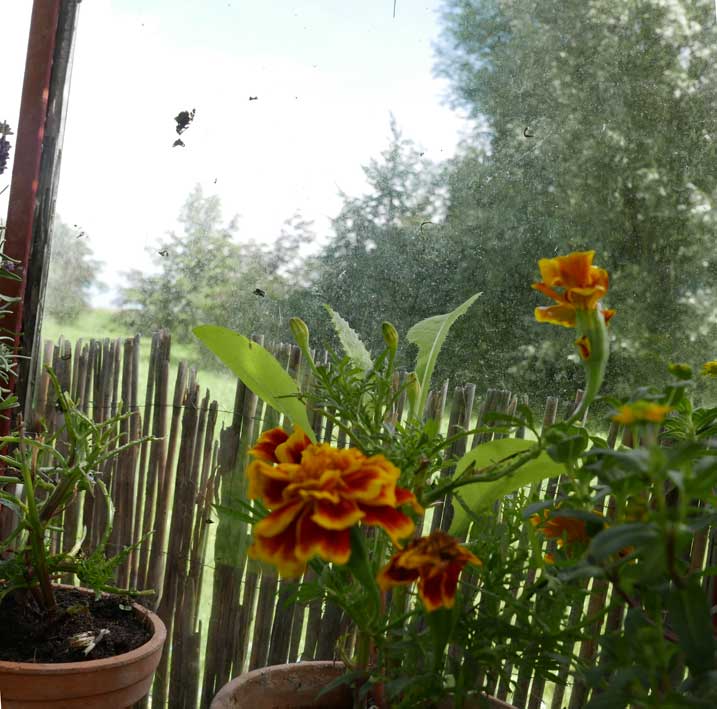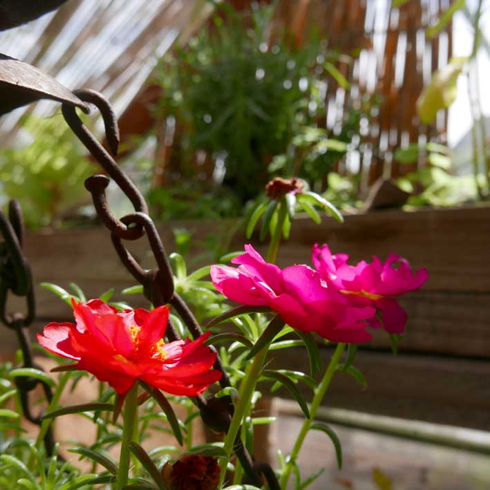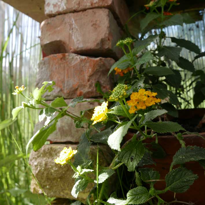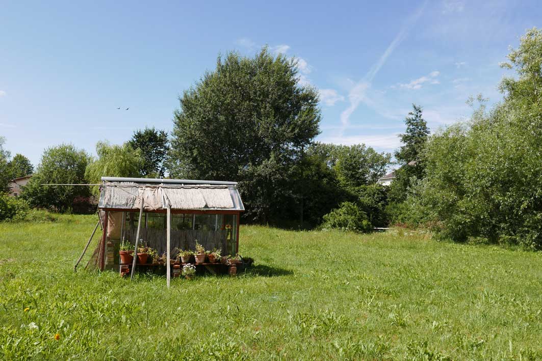 von aussen filigraner Kubus aus 4 Wänden plus Dach leicht verschalt. Die farbigen Gewächse des Inneren, lassen das Äussere kostbar erscheinen.