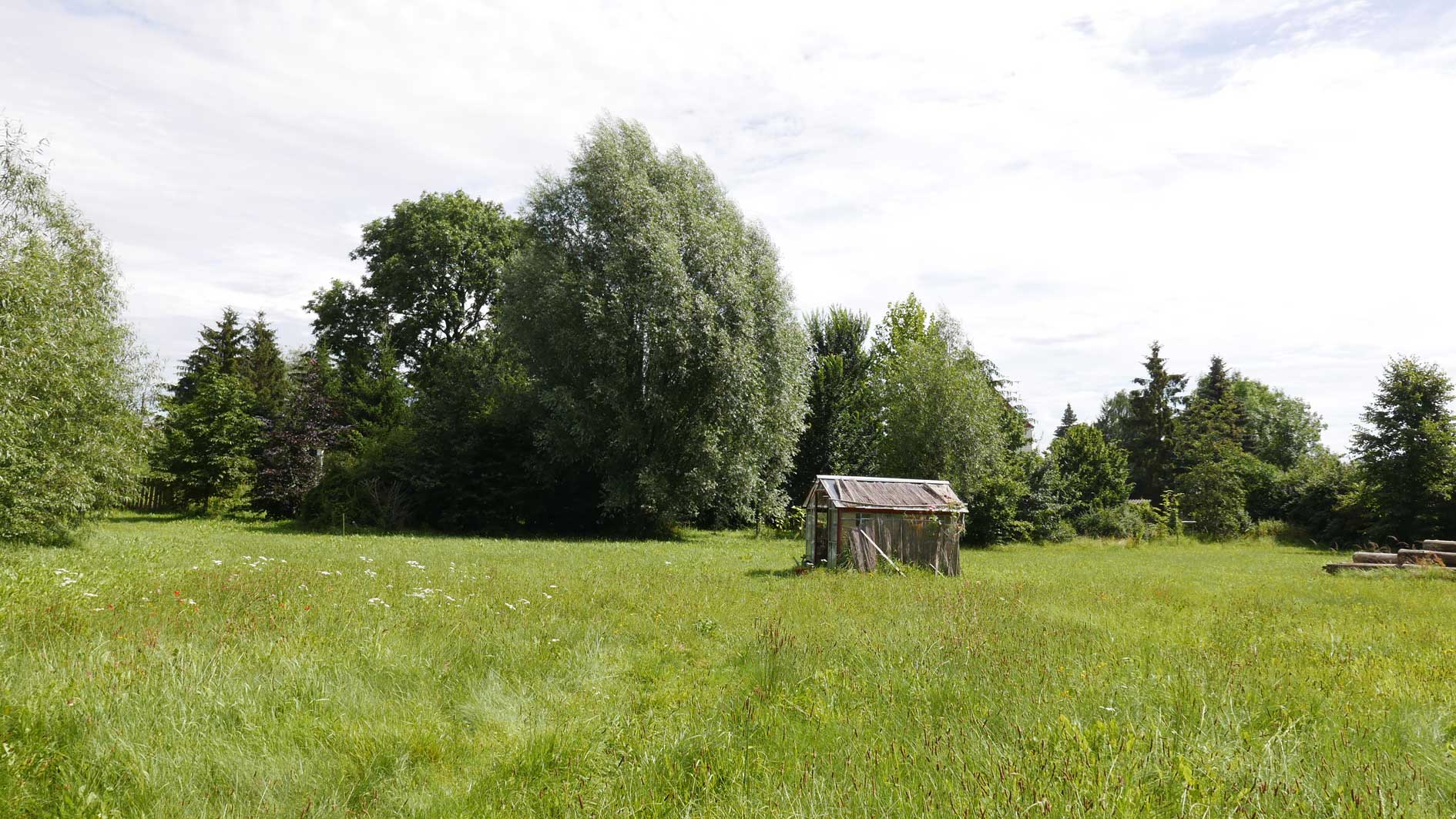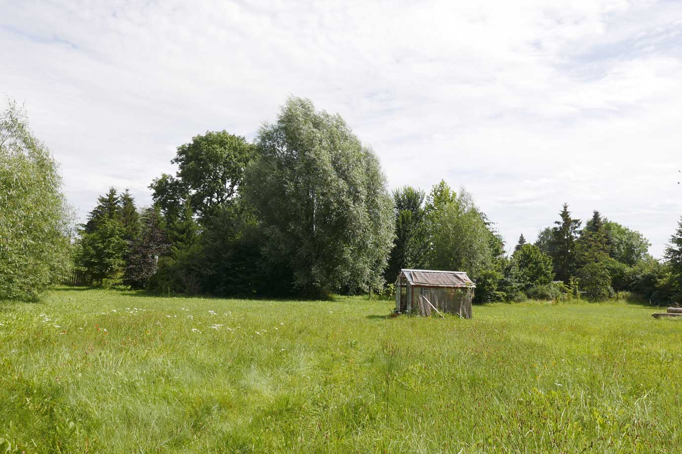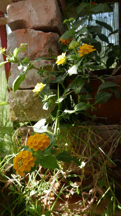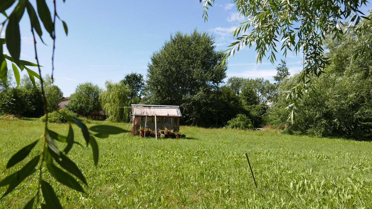 von aussen filigraner Kubus aus 4 Wänden plus Dach leicht verschalt. Die farbigen Gewächse des Inneren, lassen das Äussere kostbar erscheinen.
