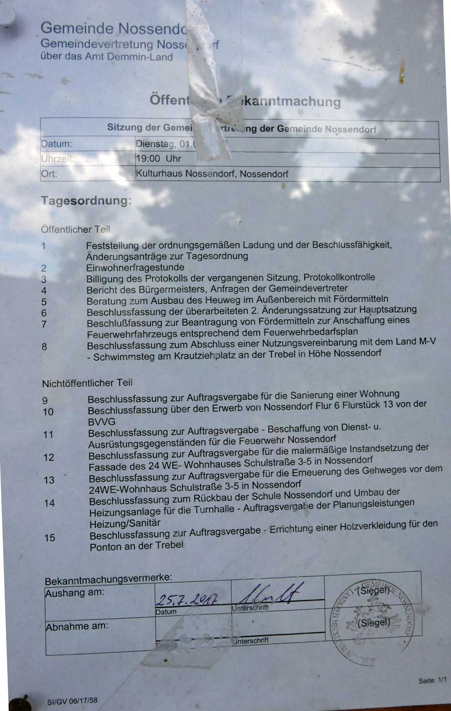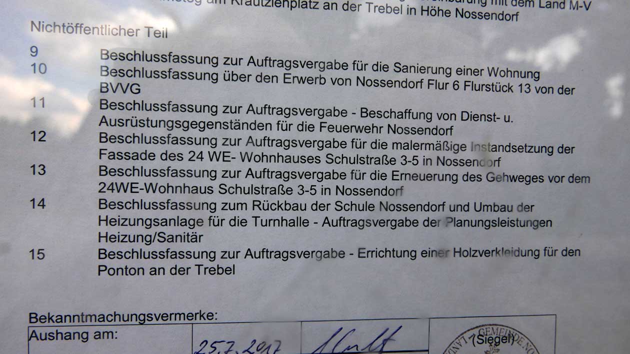 Alle wichtigen Teile die die Menschen interessieren. Das was mit Geld von wem für wen betrifft. Wie heisst es in der Kommunalverfassung des Landes: die Gemeinden als Urzelle der demokratischen Institutionen. Auf dem Lande. Wieviel Jahre nach dem Fall der Mauern. Wer besitzt das Land. Wie sehts da aus. Wer geht noch zur Wahl. Man schaue auf die Internetseite der Gemeinde N.um die Siuatiuon zu erkennen. Da findet diese Sitzung ihrer aktuellen Existenz schon gar nicht mehr statt.