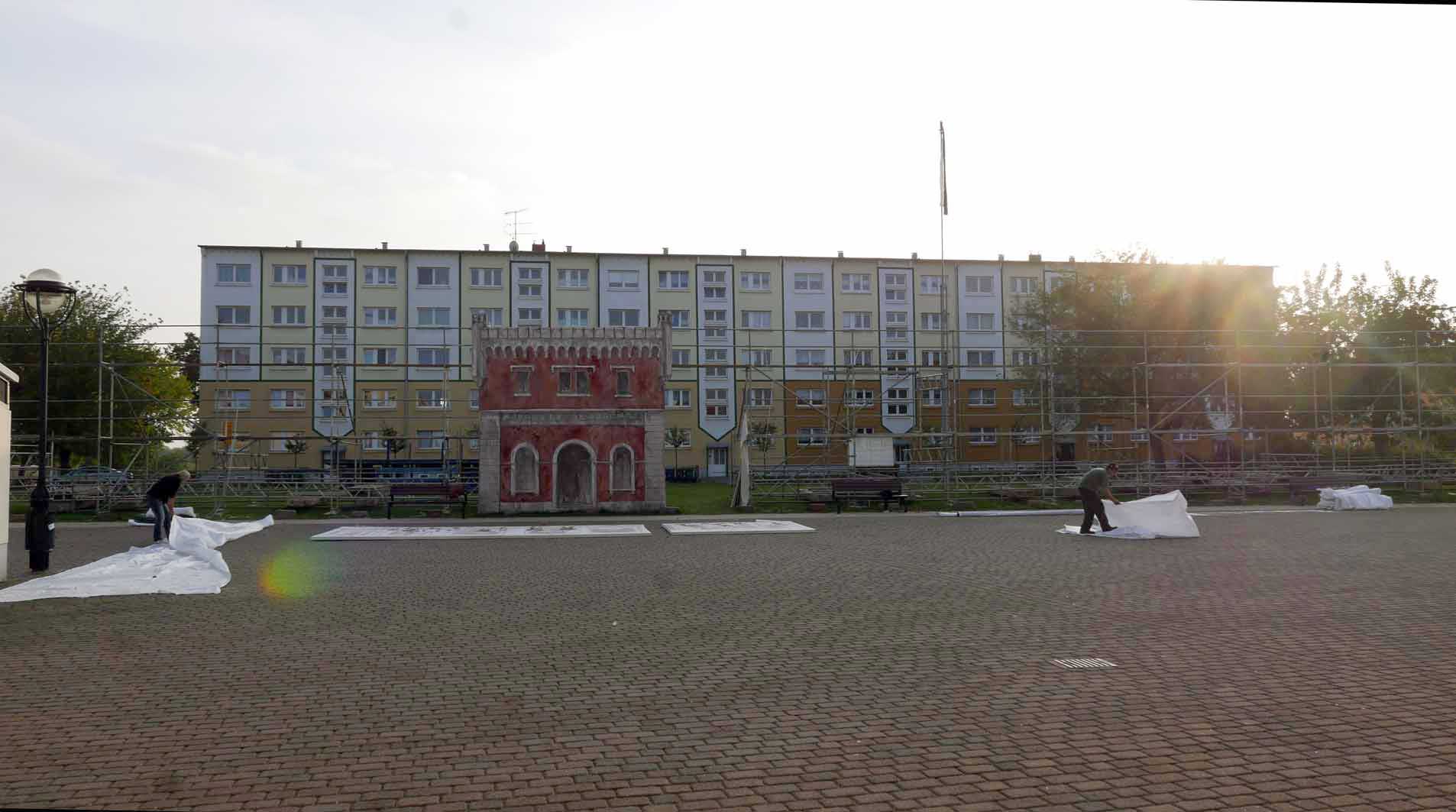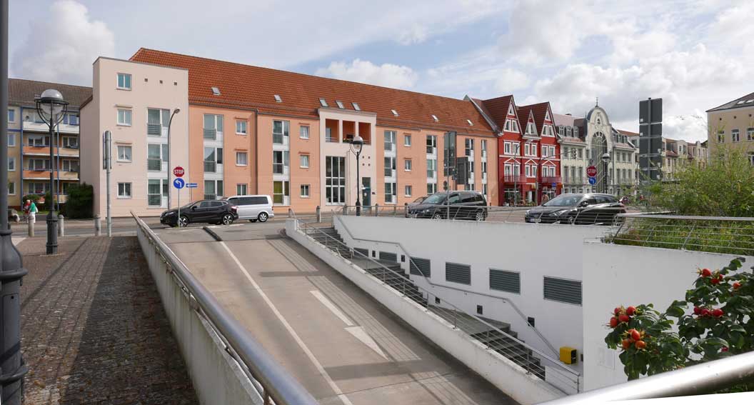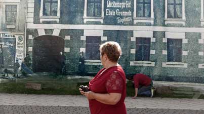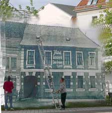 so versuchten wir in Demmin am Markt Süd-Seite vor 2 Jahren auf 100 Meter Länge die historischen Häuser nochmal anzudeuten. Immer mit dem dahintenliegenden Neubau im Nacken.