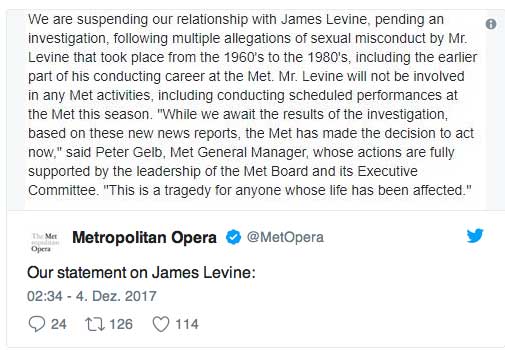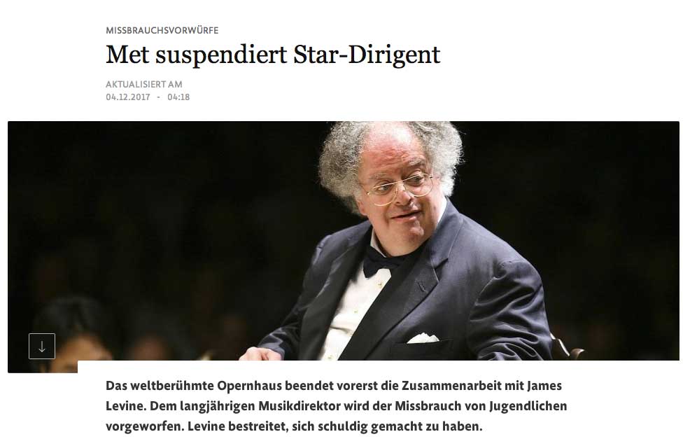 Die ãNew York TimesÒ hatte am Sonntag Einzelheiten aus einem Polizeibericht von 2016 veršffentlicht, der dem Opernhaus im vergangenen Jahr vorgelegt worden war. Au§erdem interviewte das Blatt einen betroffenen Mann und sprach mit seinen Familienangehšrigen. Demnach soll Levine, damals Anfang 40, im Jahr 1985 am Rande eines Musikfestivals Kontakt zu dem damals 15-JŠhrigen aufgenommen und die Beziehung Ÿber Jahre weitergefŸhrt haben.