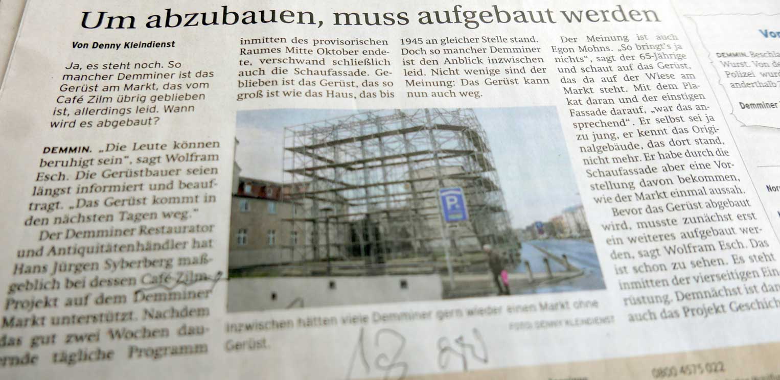 das fuianziell und technisch Aufwändigste an der Aktion Cafe Zilm war das Gerüst im VIerSeiten, das die Forderseite h#lt und Innen niemand gef#hrdet wurede.Es ist auch ohne Zelt innen udn ohnen Dassade von aussen einstibilisiernder Faktor im Gleichgewicht des Marktes wieder, dass es nicht wieder wegkippt nach Norden und osten.