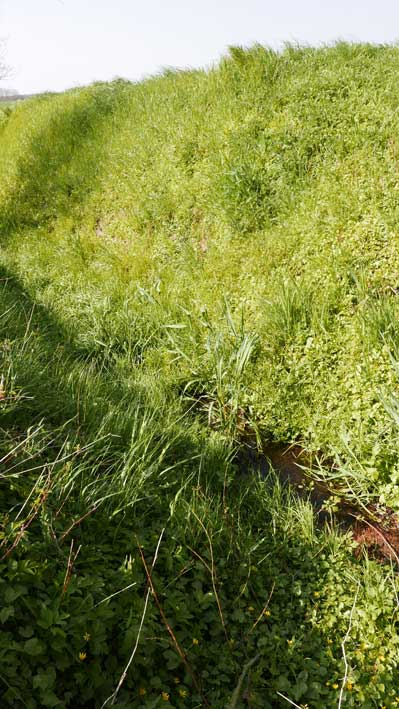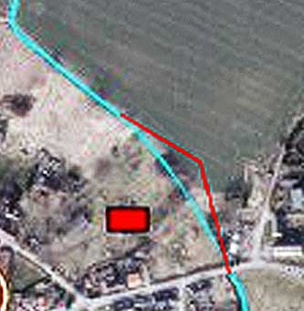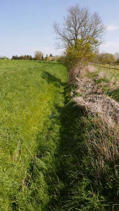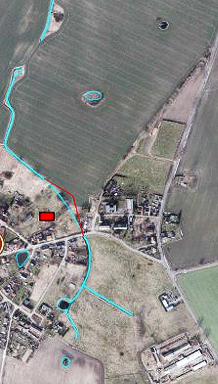 Durch das Dorf in ein Rohr gezwängt, aber aus ganz anderer Richtung als der letzte Trump auf dem Feld zum Abstieg also verläuft das Rohr unter der Erde nicht gradlinig (rote Linie), blaue Linie der Graben offen