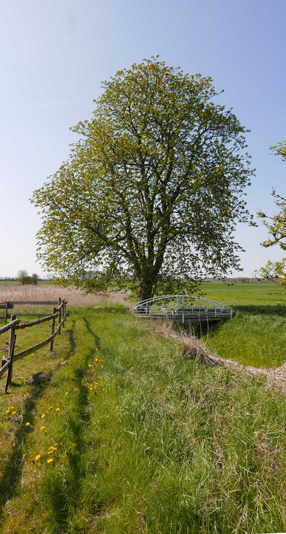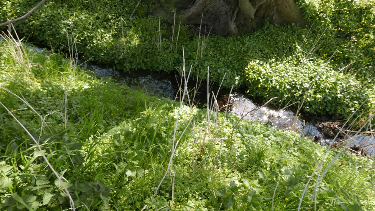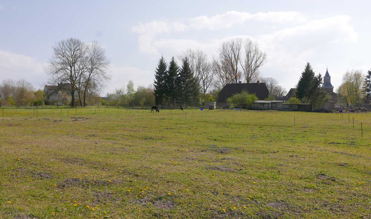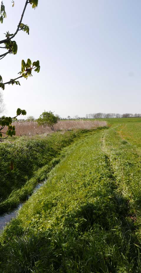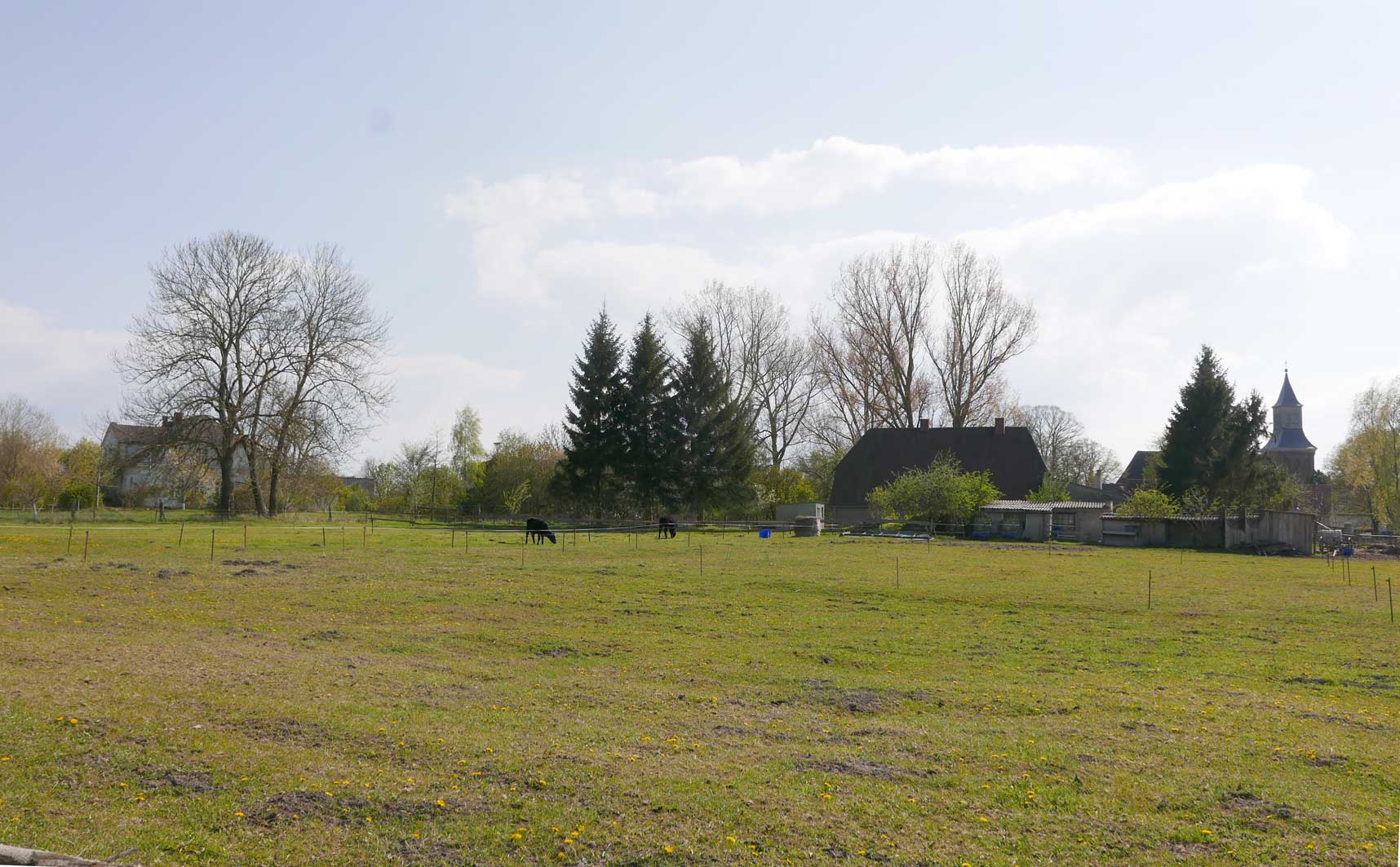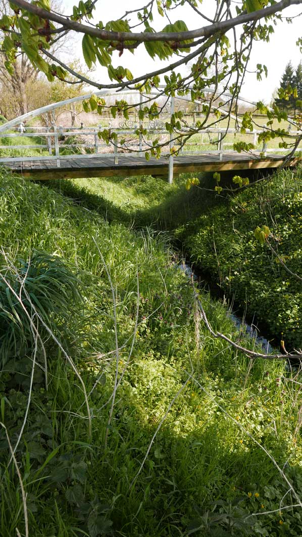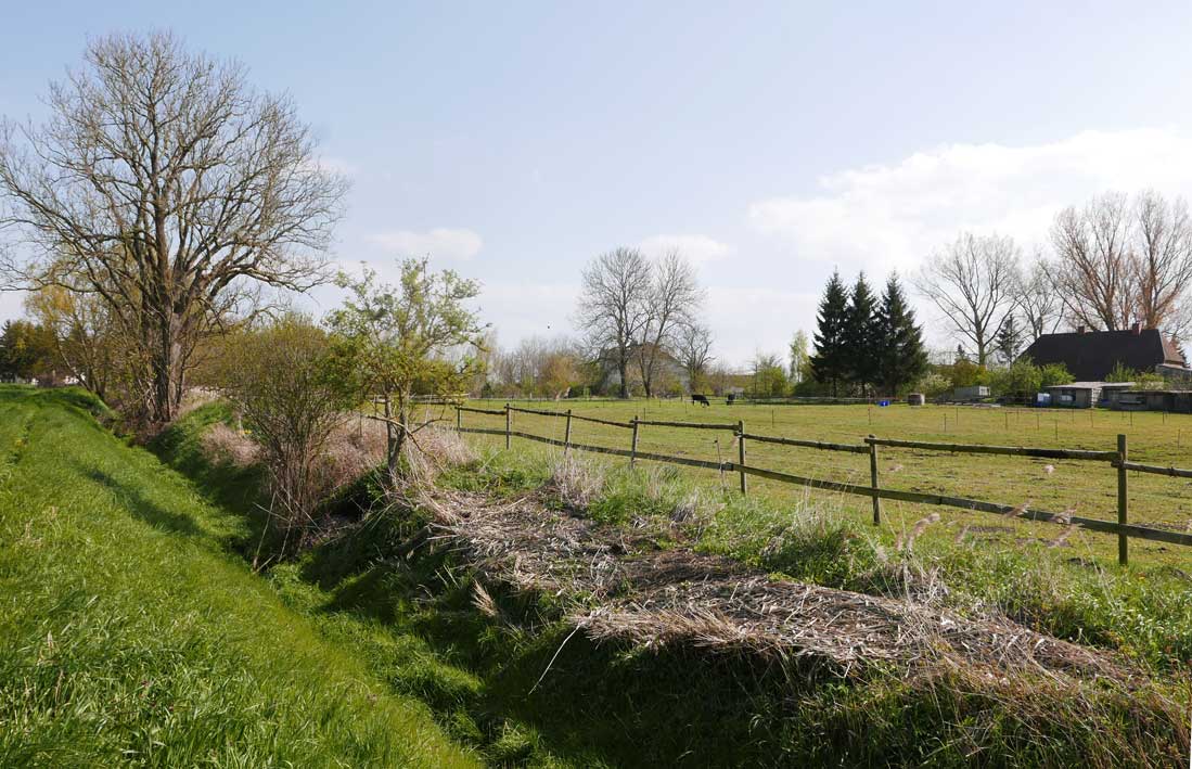 friedlich das Rinnsal des Grabens selbst im Frühjahr höchster Wasserfülle durch das Dorf und über die Felder in den Wald zur Trebel.