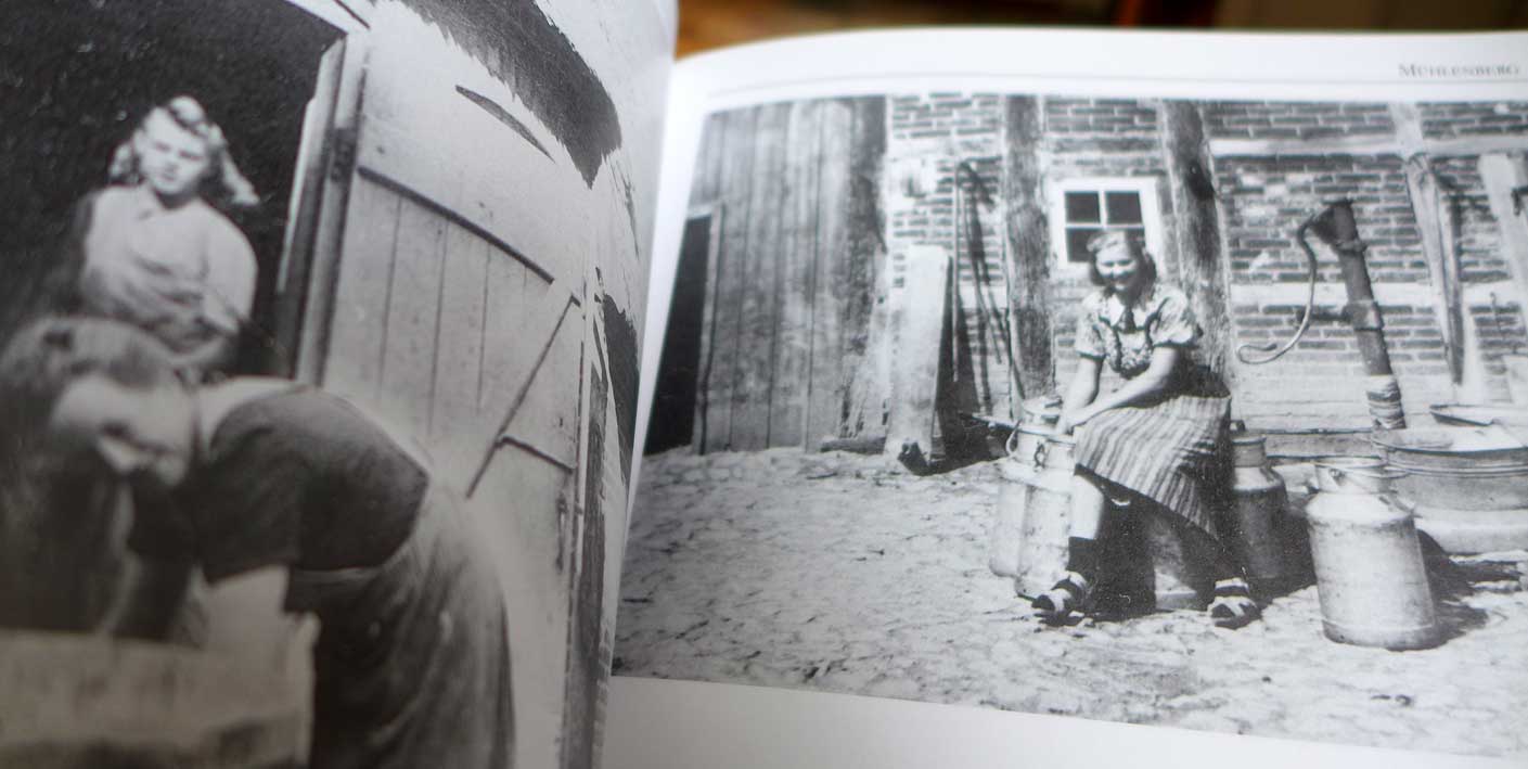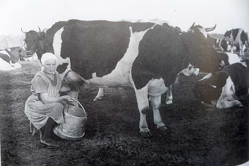 Bilder aus dem Leben damals über Jahrzehnte von den dort lebenden und arbeitenden Leuten wie z.B. diese Melkerin, die mit einer Box (Alma Bock heute 94 und 45 Jahre dort arbeitend)