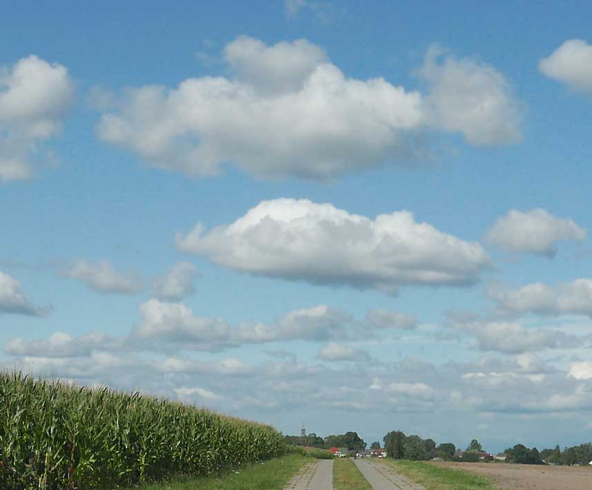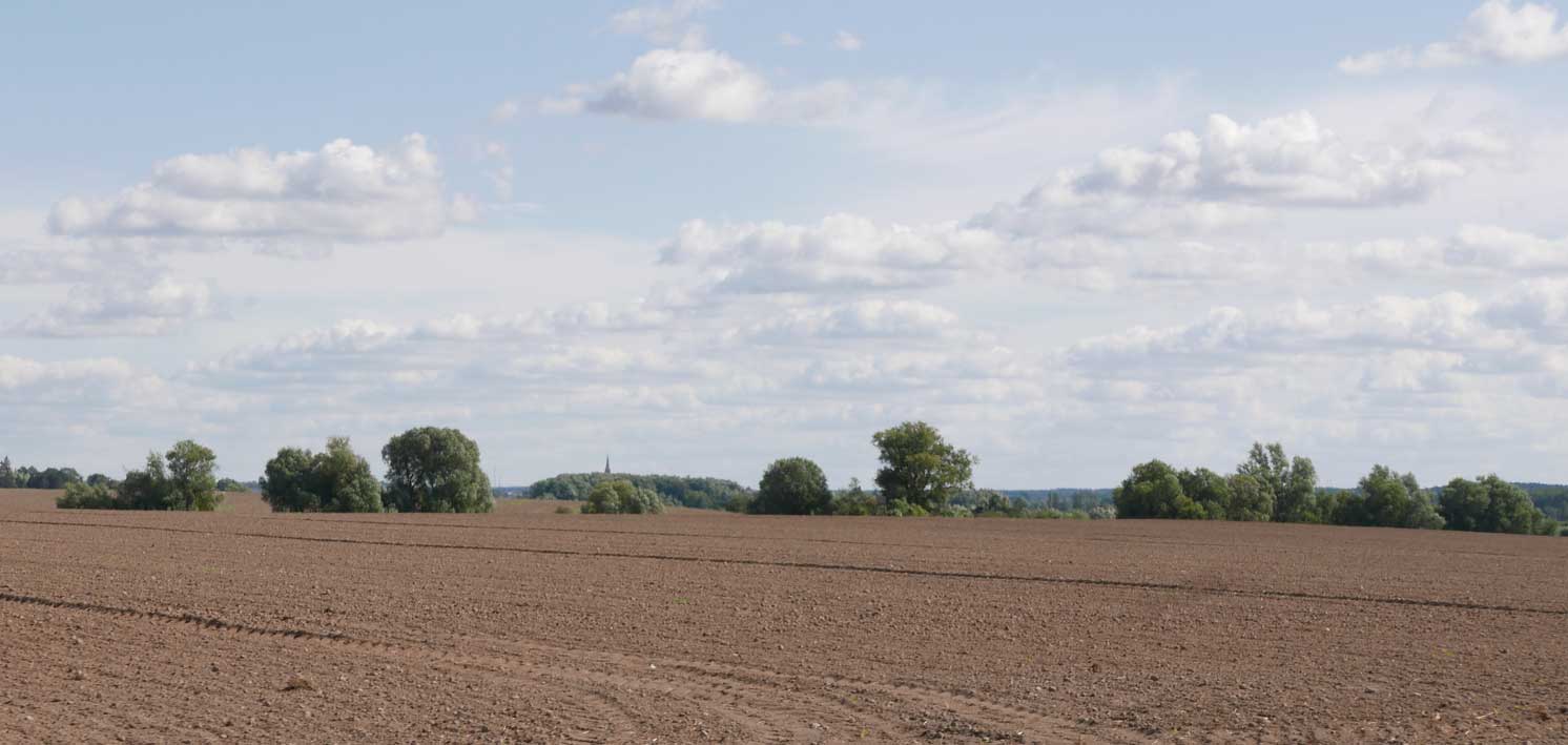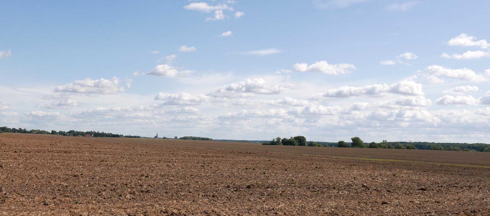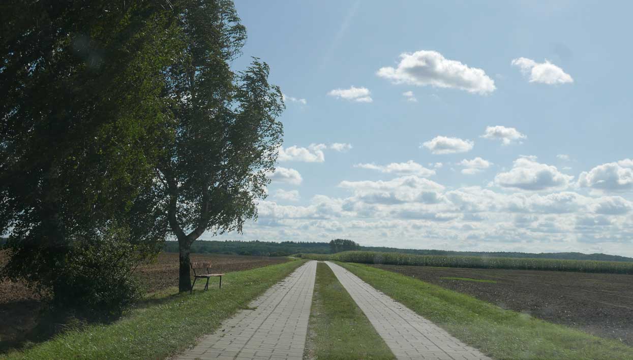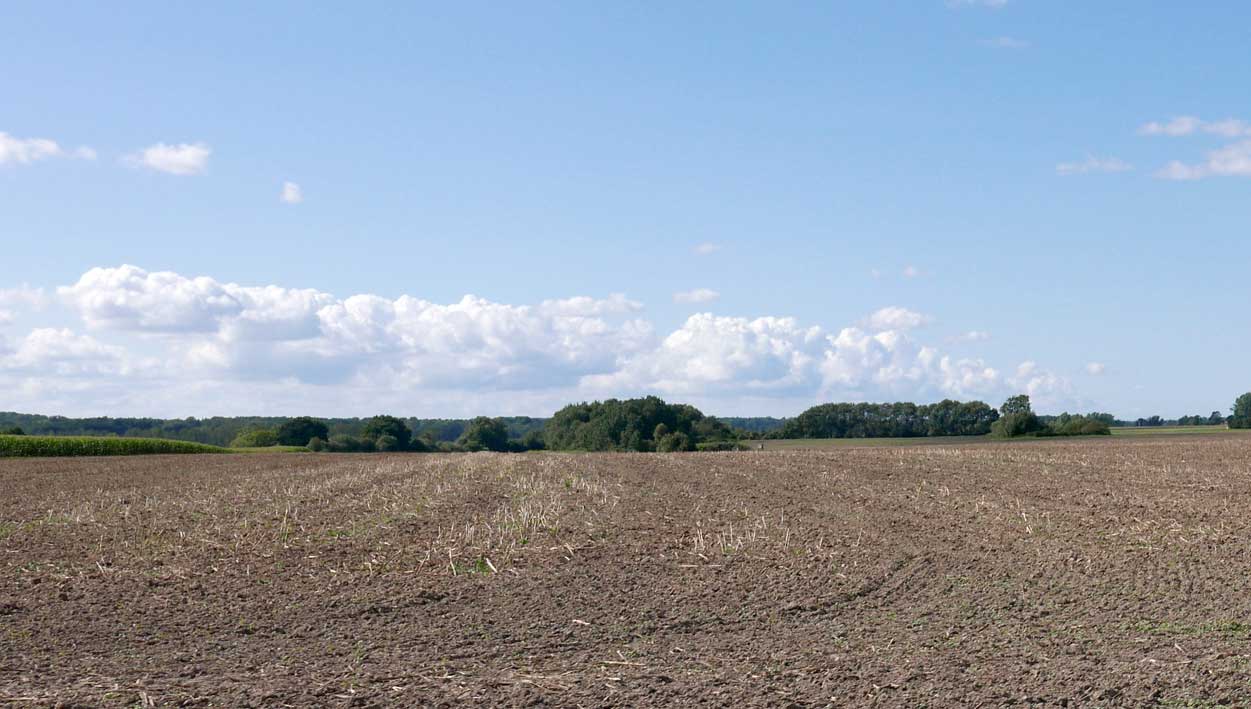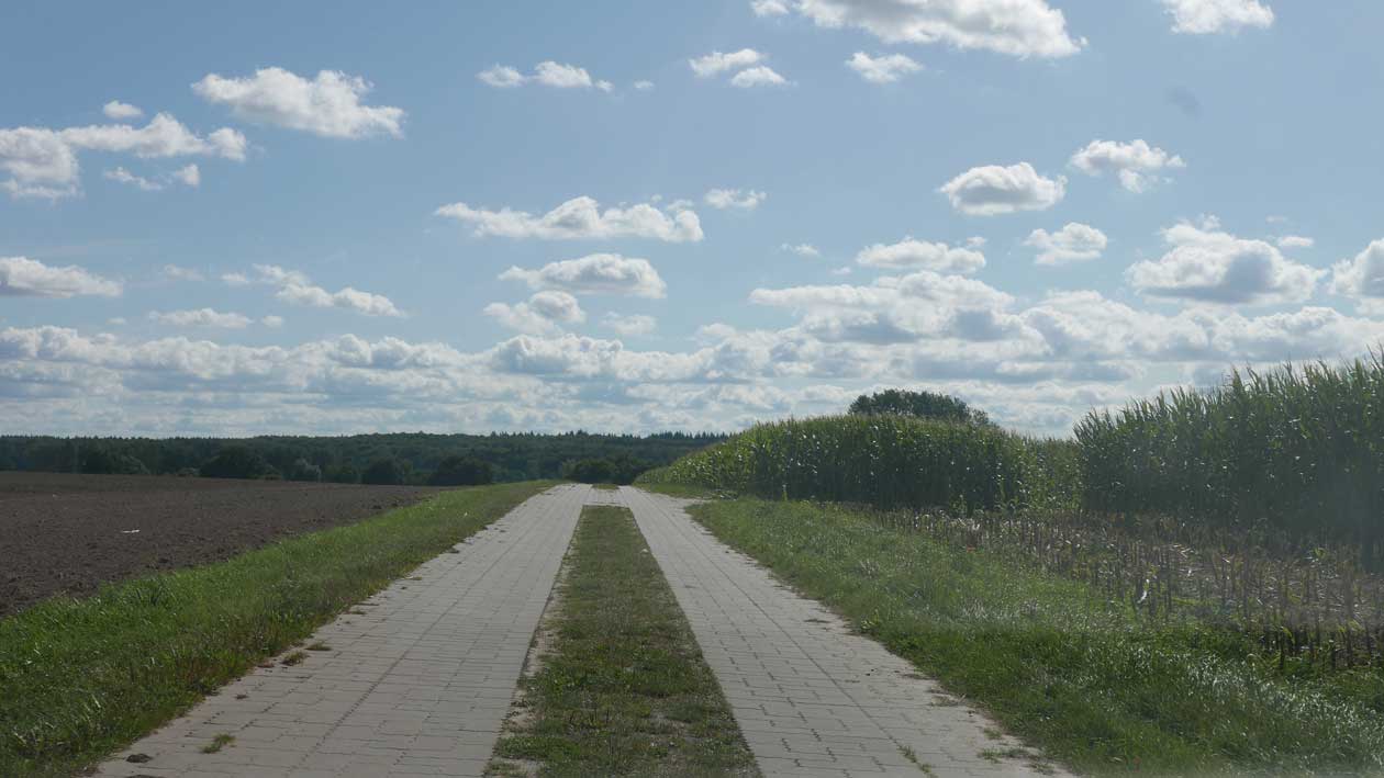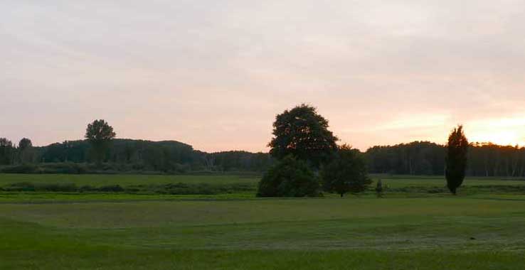 zur Rechten das Eigene Wäldchen und die Felder dazu