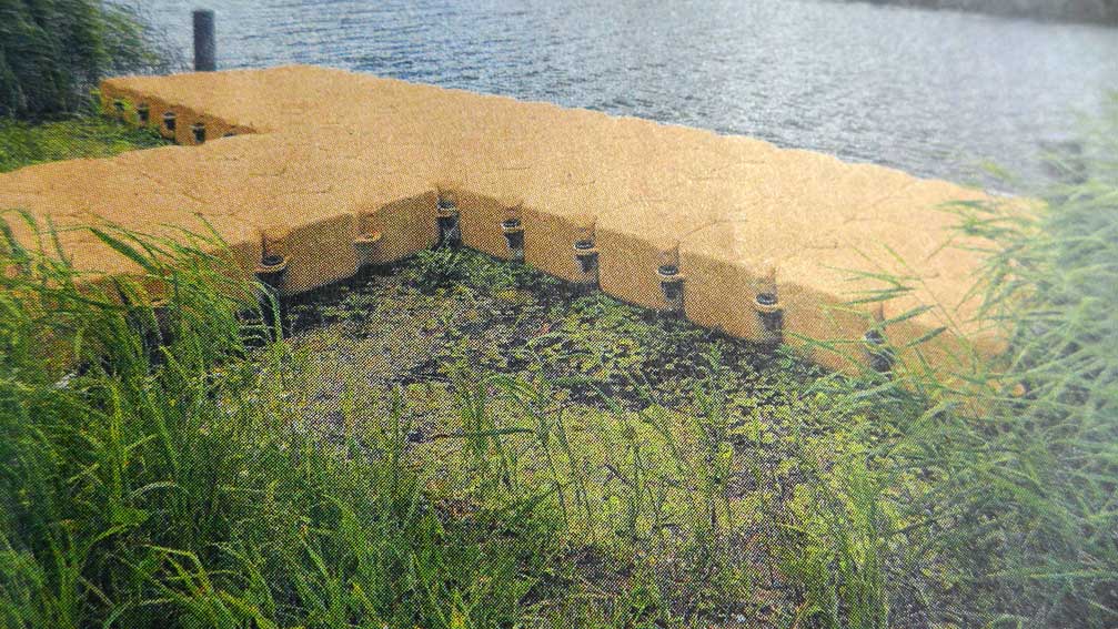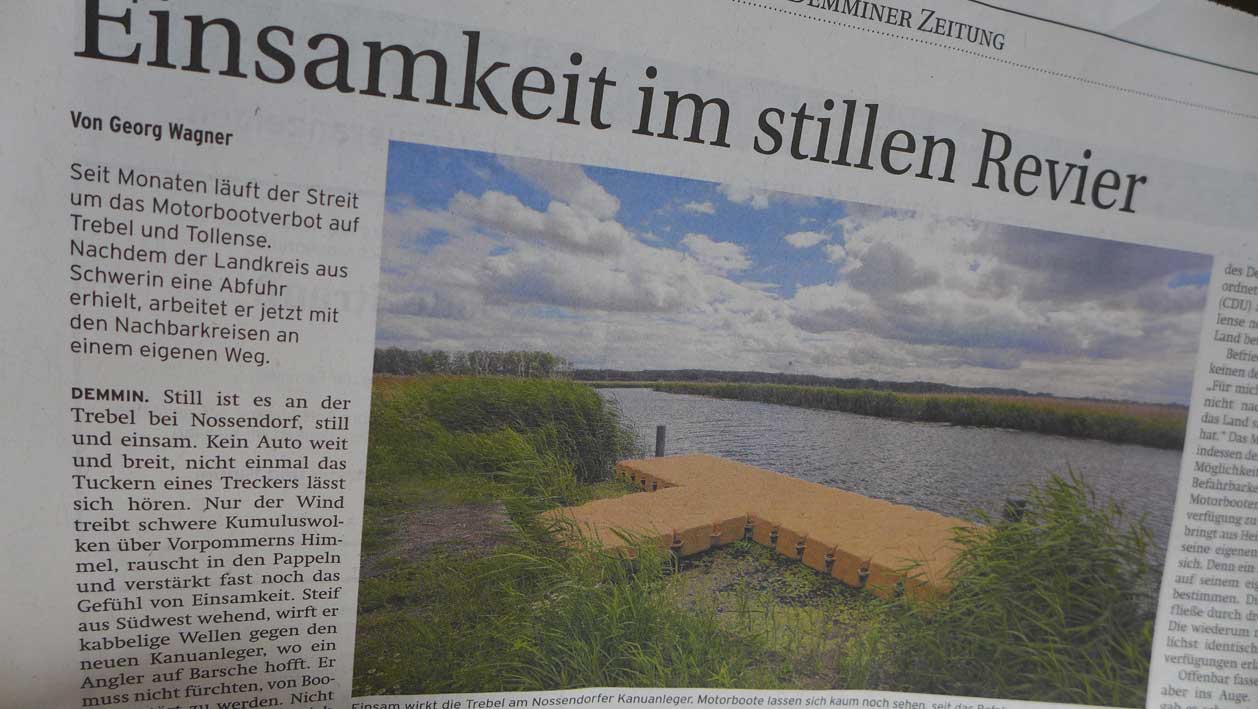 Und so sieht das nun aus, an der Trebel im Staatlichen Umweltamt, Mecklenburgische Seenplatte eine moderne Anlegestelle aus Plastik direkt neben -oder als- der Badestelle des Dorfes