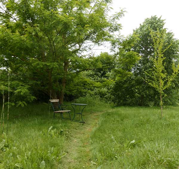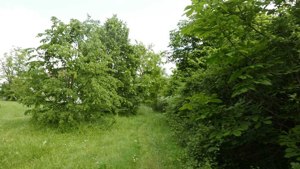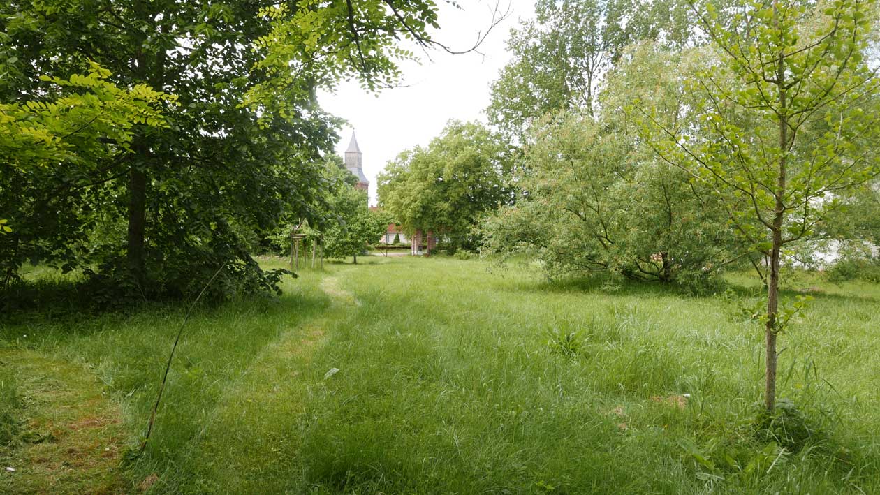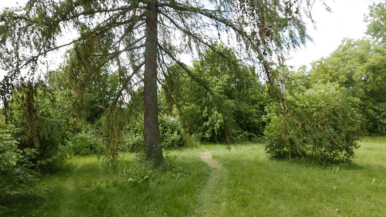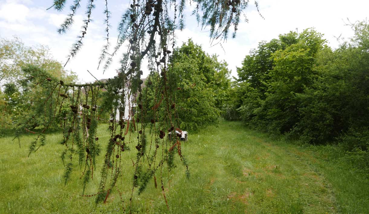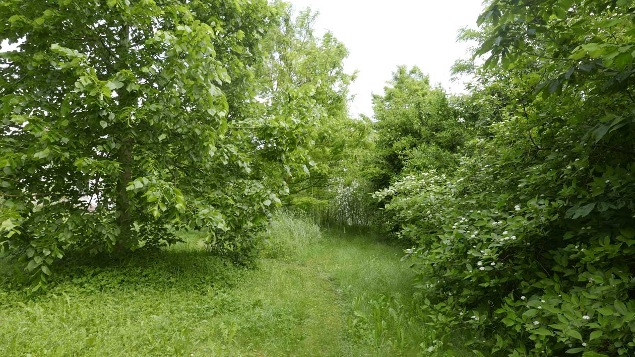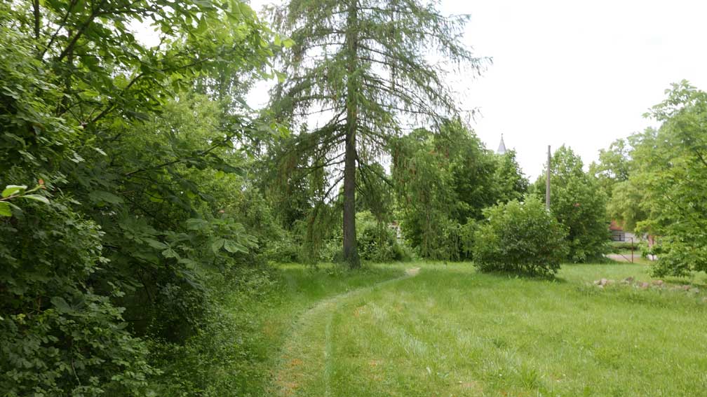 durch die Enge der dichter werdenden Bäume und an der Mauer entlang