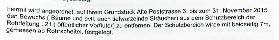 Keiner der Gründe, die für die Entfernung der Bäume über dem LPG-Rohr angeführt werden, können überzeugen. Eine neue Kanalanlage nimmt des Abwasser der in der LPG-Zeit entstanden Plattenbauten auf, der ehemailge LPG Viehbetrieb (heute Eigent. L.), darf seine Abwasser (Gülle) nicht mehr einführen, Kleingärten im früheren Park sind von ihnen selbst gewaltsam entfernt worden, das Grabensystem vor und nach dem Rohr ist verkrautet, weil ohne Gebrauch und Bedarf. Eine Karte des Rohrverlaufs existiert nicht.