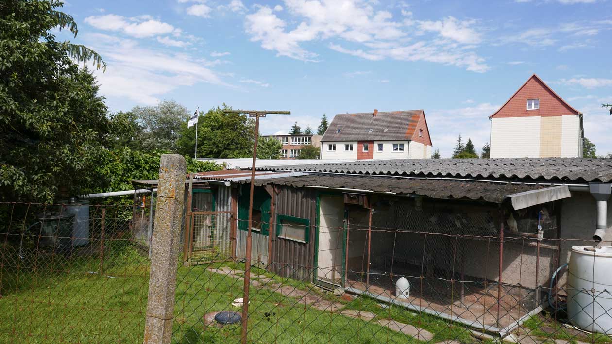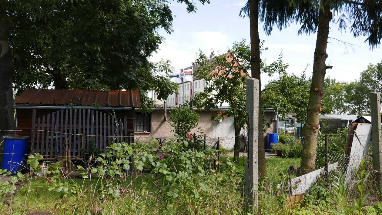 Nebenan die neu entstanden Garagen-Gärten der Plattenbauten, deren Pforten zu der neuen Parkanlage, die wir offen ließen. Hühner und Enten haben Zugang zu unseren Bereichen.
