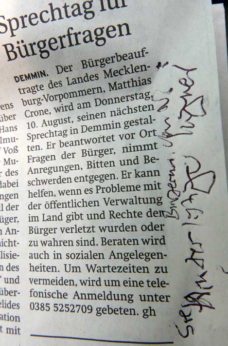Dieser Mann -wieder im Lande unterwegs- trat in N. als Mediator auf. Zwischen Gemeinde Rat und und Uns. Nachdem der aktuelle Bürgerm. ohne Stimmen der Bürger hinter sich zu seinem Gegenüber von "hinterlistigem Betrüger" sprach ohne mediative Ermahnung oder Verweis war die Basis jeglicher Achtung verlassen. Der Bürgeranwalt schrieb abschliessend: nun sei wohl wohl alles gut. Seitdem gibt es keine Partnerschaft mehr im Dorf der selbsterm. LPG Erben des Hasses und einer kulturellen Zukunft. Wenn Politik aus den dörflichen Zellen wächst und zu erkennen ist, steht es schlecht im Lande.