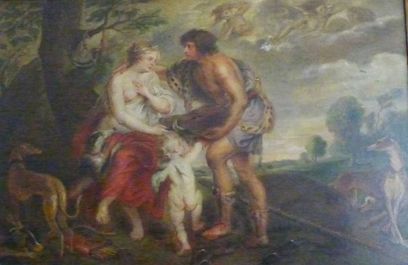 verstümmelt von ehrgeizigen Museumsleuten in München weil sie meinten nur der mittlere Teils sei von des Meisters Hand, so, dass die Kopistin nun das Gesamtkonzept aus der Pinakothek dort uns erhielt wie es noch vor hundert Jahren dort hing, und nur so und hier nun seit Kindsbeinen überlieferte. Im selben Jahr zurückerworben wie dies Haus dazu, aus dem es kam.