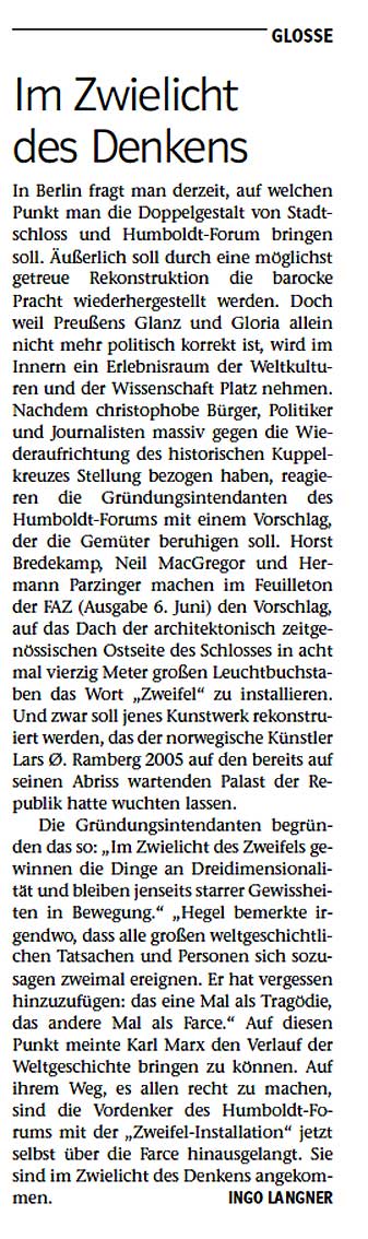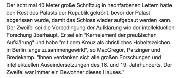 Solange gebrütet um nun diesen Krüppel des Gedankens zu gebären, den nicht mal ein Ulbricht erfunden. So ein Krampf vor dem Schloss in Berlin nun würde man im Bayern des Herrn Parzinger als derzeitigen Leiter des preusischen Kulturbesitzes sagen.