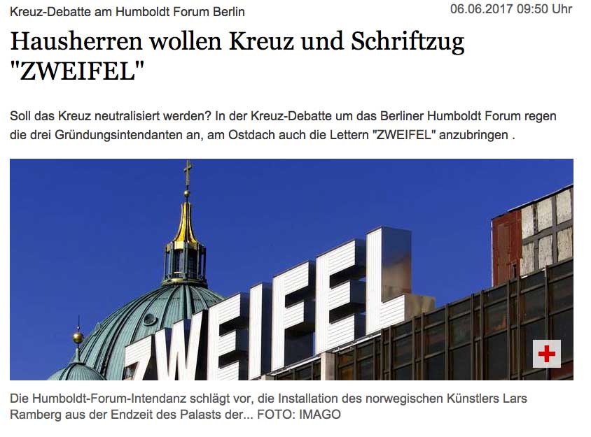 Das Intendanten-Trio schlägt außerdem vor, eine Nachbildung des Sanchi-Tors aus den Dahlemer Sammlungen vor dem Schloss aufzustellen, gegenüber dem Lustgarten. Das antike buddhistische Monument würde, so heißt es in dem Text, "die Botschaft des Humboldt Forums - Erlebnisraum der Weltkulturen wie der Wissenschaft zu sein - nach außen tragen" und wäre an dieser Stelle außerdem "eine südasiatische Antwort" auf das Brandenburger Tor. "Der Zweifel in seiner Wortgewalt, zusammen mit der mächtigen Bildwelt des Sanchi-Tors und dem Kuppelkreuz laden dazu ein, die Welt nicht allein durch die Augen des eigenen Selbst zu betrachten". Dies sei die Botschaft des Humboldt Forums.