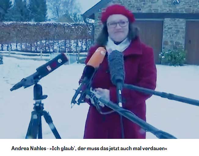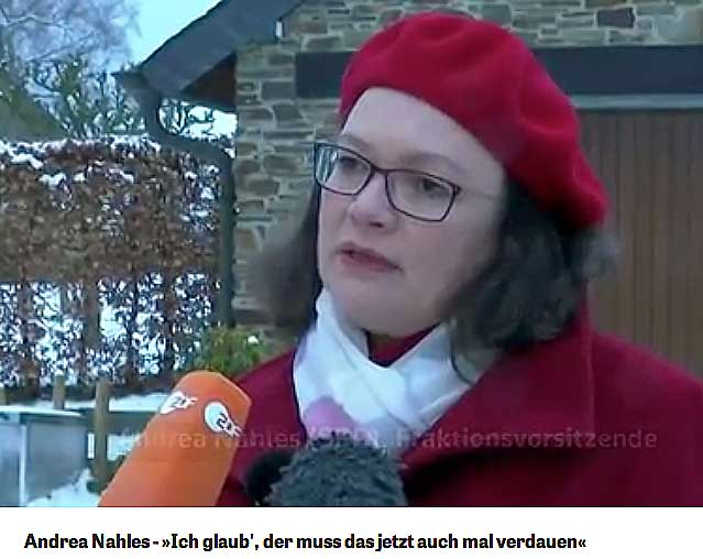 Aus den Entwürfen neuner Regierungsmöglichkeiten. Den geplanten Aussenminister verloren. Zuvor dass der bisherige traurig wenn er nicht mehr dabeisein darf. Der Beliebte bei den Wählern, und wie nun der sich vorgedrängte Genosse im Shitstorm dieser Wähler, sich zurückzog, aus dem vor einem Jahr als Heilsbringer gefeierter, nun als Gedemütigter, früher nur der Pistole fähig. Mit dem Kommentar eines Mandarinen-schälenden Zeugen in der Nacht der Eintscheidungen im Schweigen einer Entweder-Oder Drohung. Aktuelle Auftritte der neuen SPD-Chefin in Karnevalsmaske vor fertigbau-Garagen des Eigenheims.