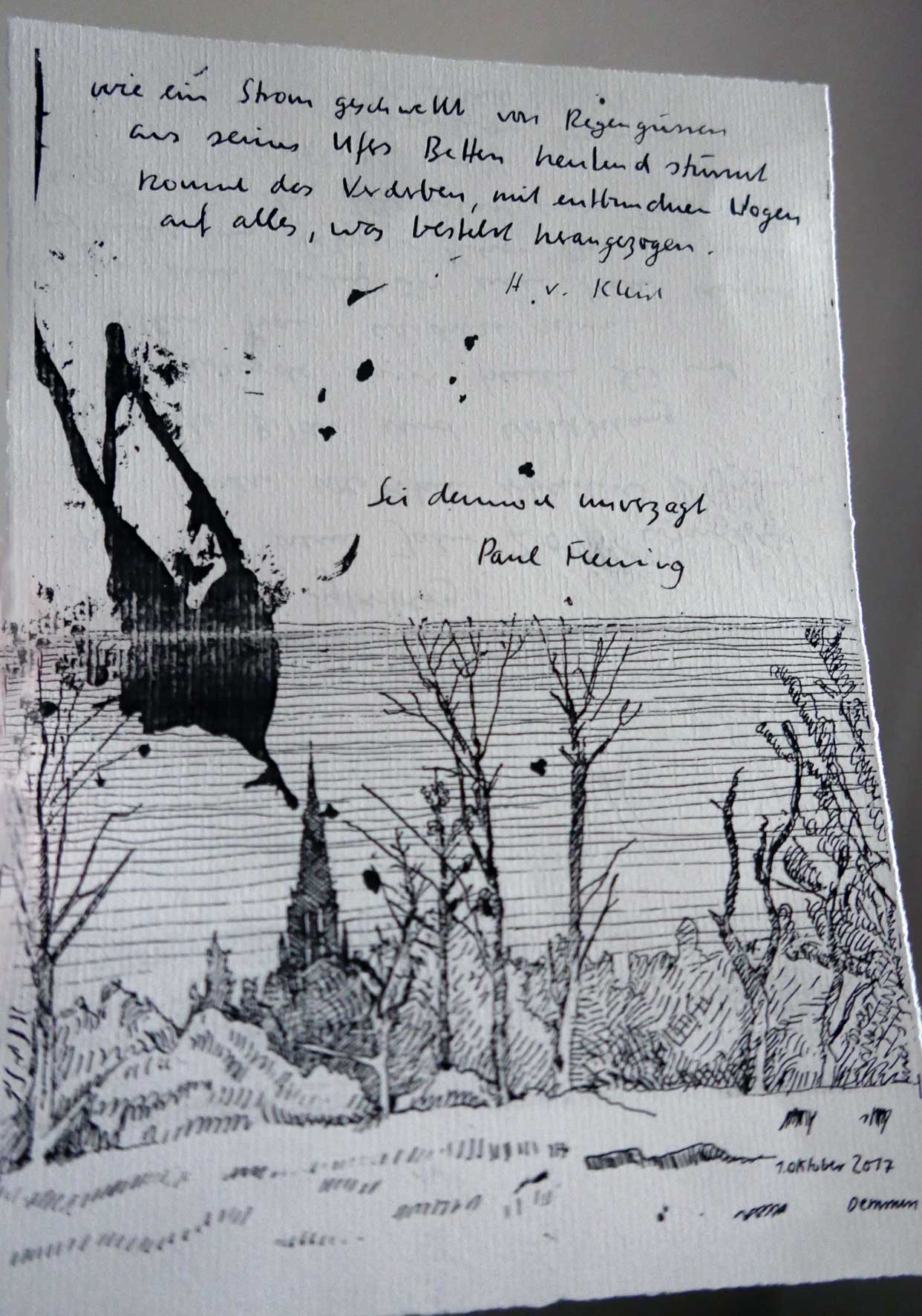 entstanden oft Beobachtungen der Natur in der Kiunst, aber auch Die Göttliche Komödie entstand auf der Flucht oder die Pisaner Gesange im Käfig der Gefangenschaft oder die Bilder der schwarzen Zimmer Goyas. Was aber sind die Aufträge der Zeiten dann. Heute erleben wir die Folgen von Auschwitz in Israel und das verfluchte Europa. Bis in die kleinesten abseitigen Gegenden. Und sind doch Themen unseren heutigen Möglichkeiten angemessen zu beantworten. Erkennend und überwindend. In neuer Dimension.