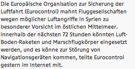 US-Präsident Trump befeuert Spekulationen über einen Militärschlag in Syrien. Russland droht mit "sehr traurigen und ernsten Ereignissen". Die Luftraumüberwachung Eurocontrol warnt bereits vor Raketen und Marschflugkšrpern.