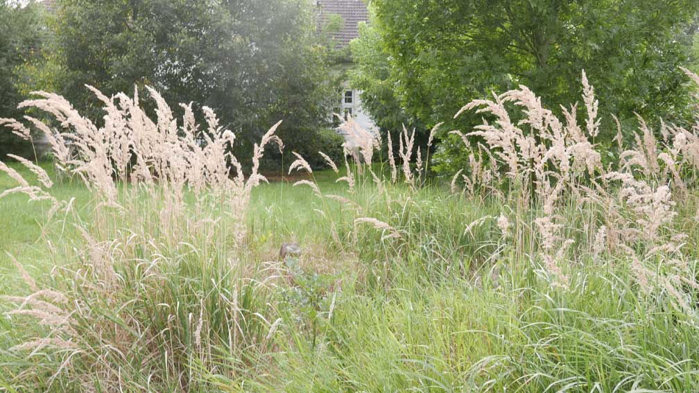 Und das Regenwasser des Daches sammelt sich nun ohne Graben ihrer Verrohrungen unten in eigenen Dränagen zum wieder ausgehobenen Teich