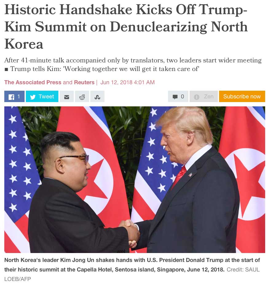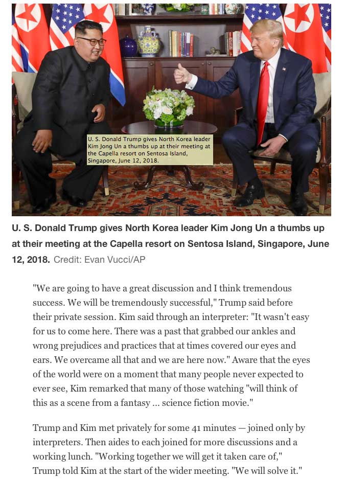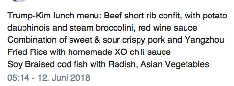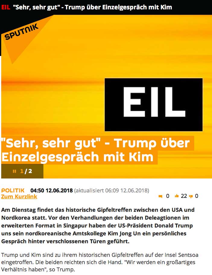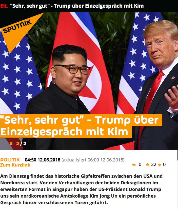 während Sie schliefen hat in Singapur der historische Gipfel zwischen dem US-Präsidenten Donald Trump und dem nordkoreanischen Diktator Kim Jong Un begonnen. Um 3 Uhr nachts - 9 Uhr Ortszeit - begannen die Gespräche, zunächst nur zwischen Trump und Kim und ihren Dolmetschern (vor diesem Teil fürchteten sich viele Nordkorea-Experten am meisten, weil Trump wenig Detailwissen hat und beide Seiten nachher in Ermangelung von Zeugen über das Treffen behaupten können, was sie wollen). Etwas später stießen die Berater hinzu und kurz vor sechs Uhr früh deutscher Zeit trafen sich die Politiker zum Mittagessen.
