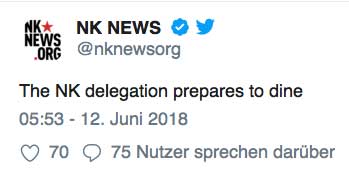 Spätestens heute Vormittag wird sich wohl zeigen, wie das Treffen verläuft, sei es durch einen Trump'schen Tweet oder durch die für gegen 10 Uhr angekündigte Pressekonferenz. Trump hatte zuvor gesagt, er werde "in der ersten Minute" spüren, ob Kim es ernst meine mit der Denuklearisierung - na dann schauen wir mal, wie Trumps Gefühle sich heute Morgen so verhalten.