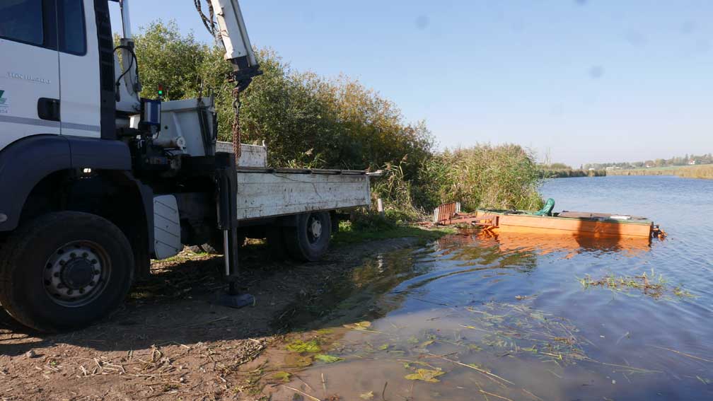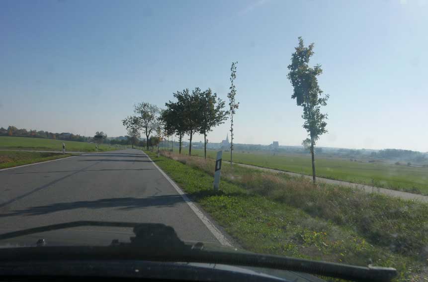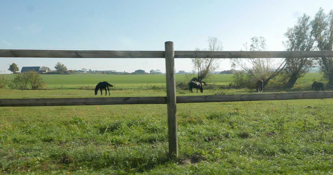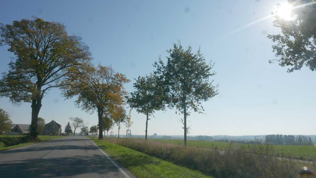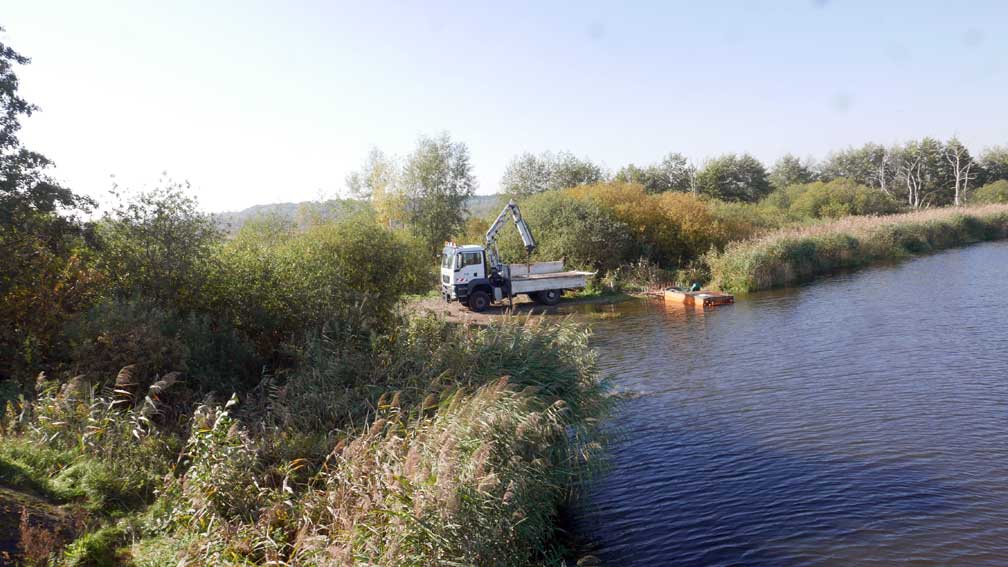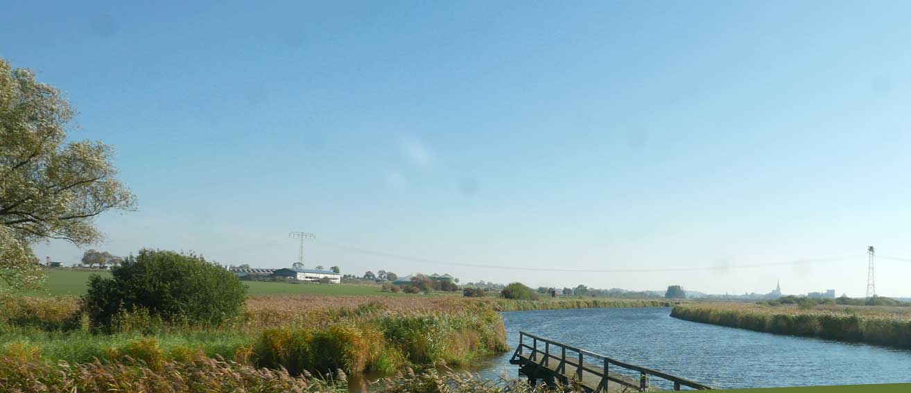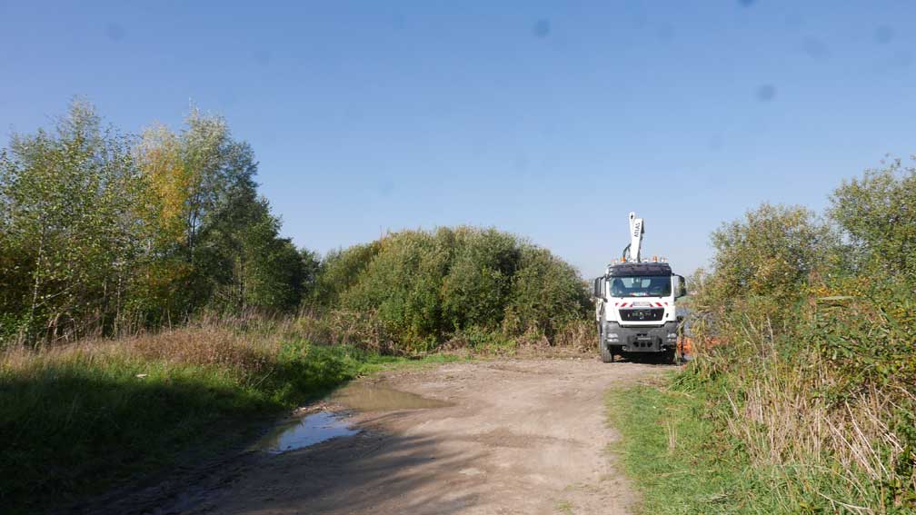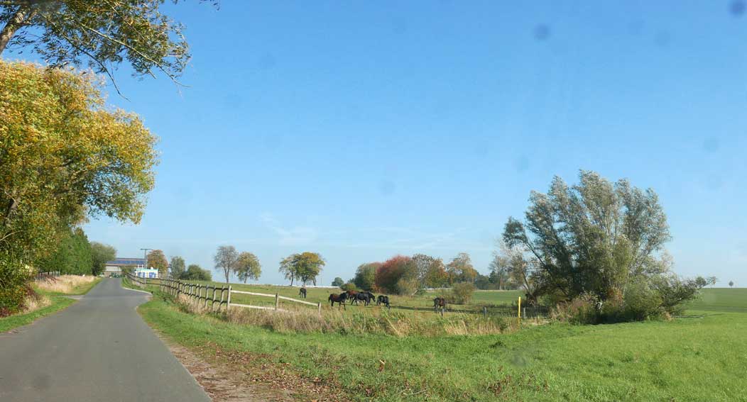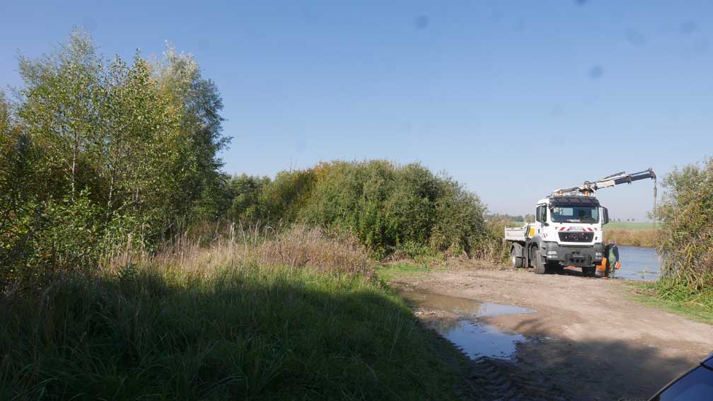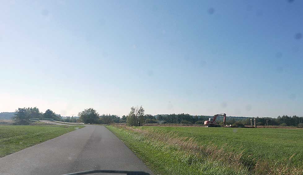 alles das muss weg hier was jetzt grün ist und betoniert und Schotter drauf und Stahl die Stangen 8 Meter tief dass es hält, weil der Graben da ist und dahinter das Wasser imd Moor