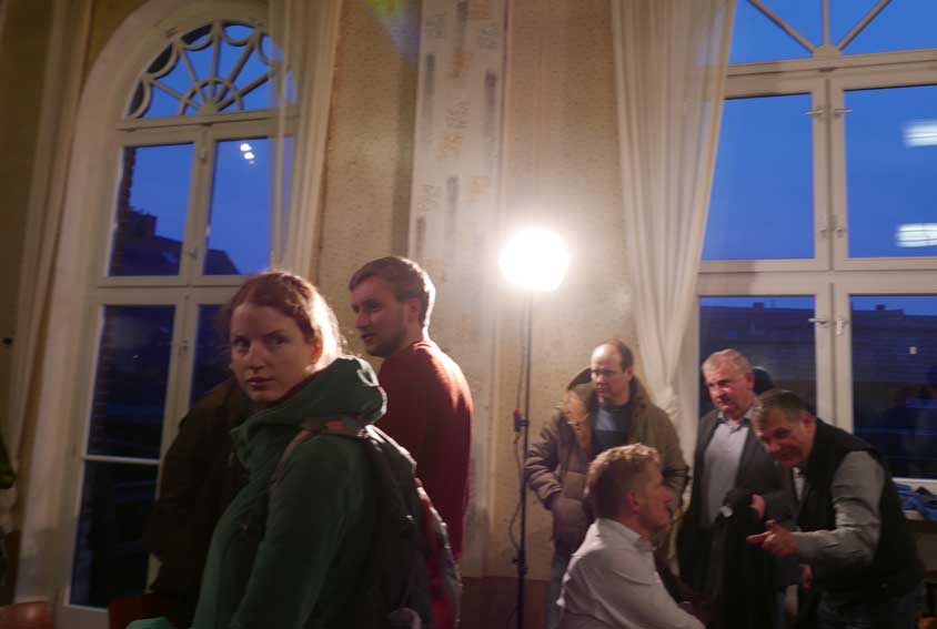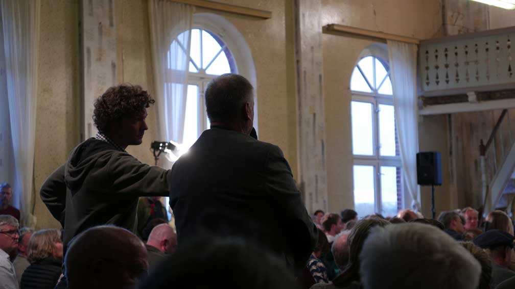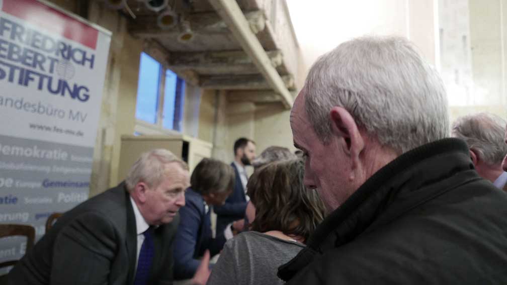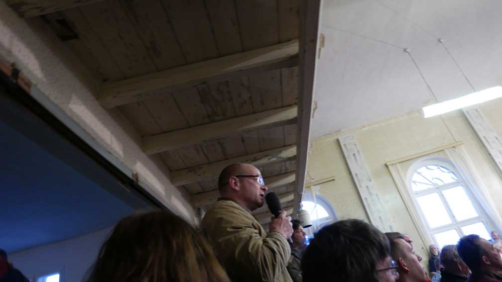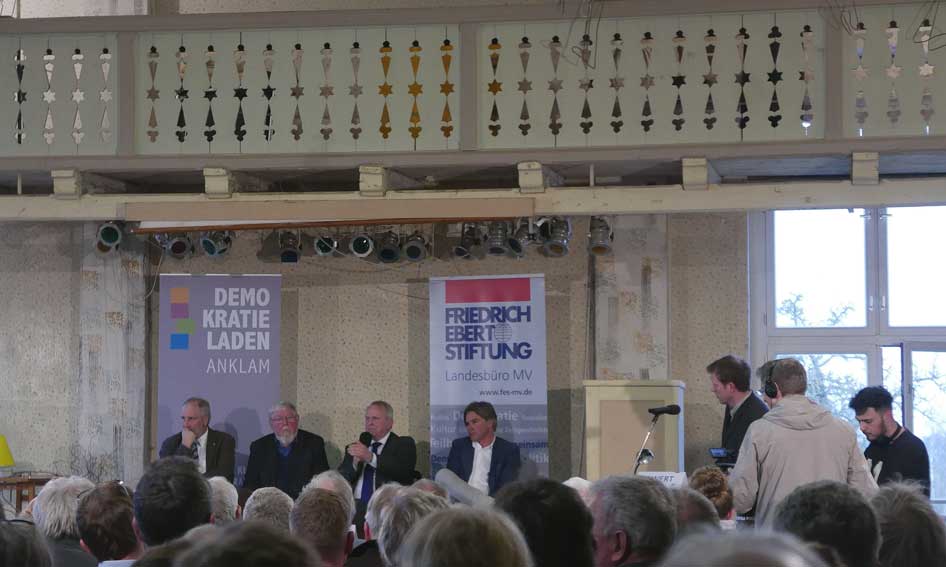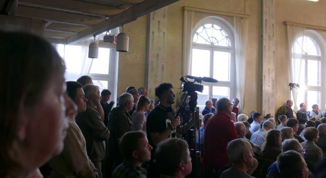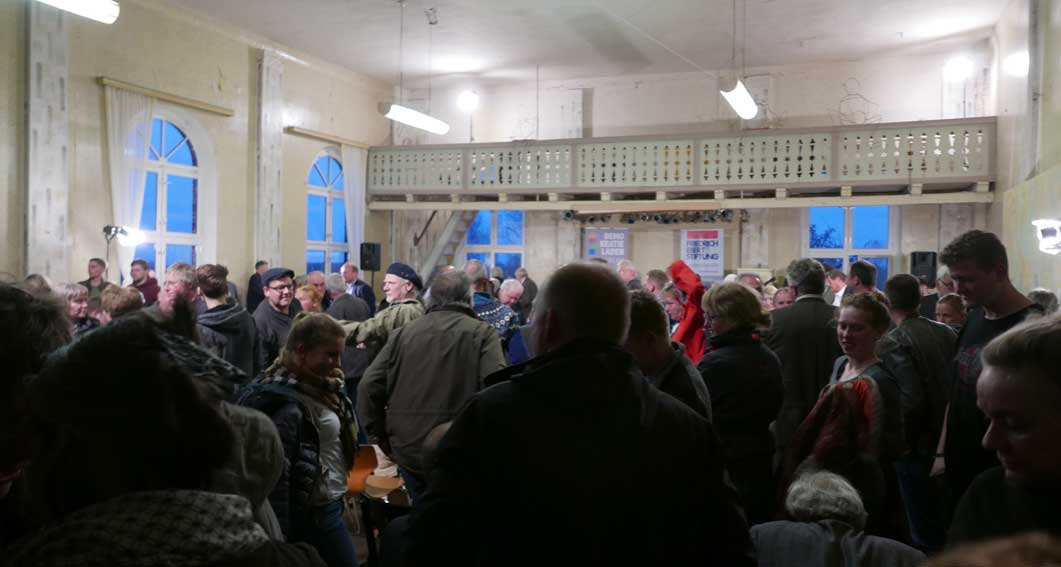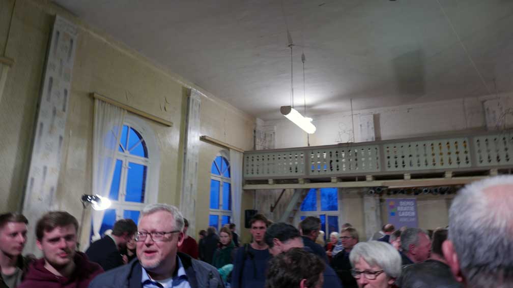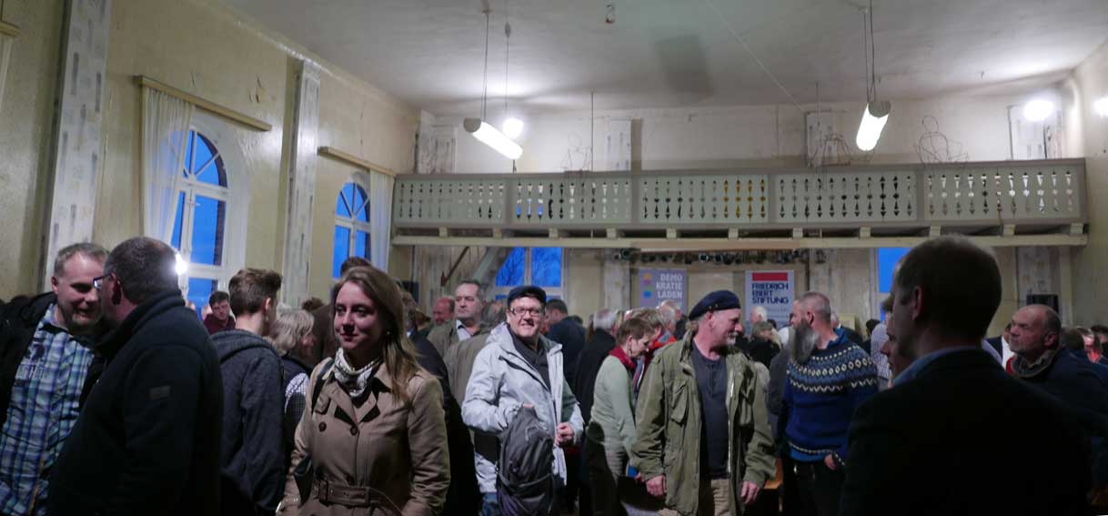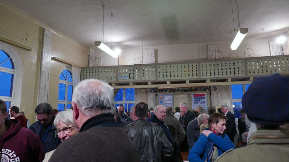 Versammlung zum Thema aktuelle LandWirtschaft,Umwandlung zu Bio, in Loitz, der Stadt an der Peene bei Demmin. Bei Tucholsky dem richtigen Haus. dafür.