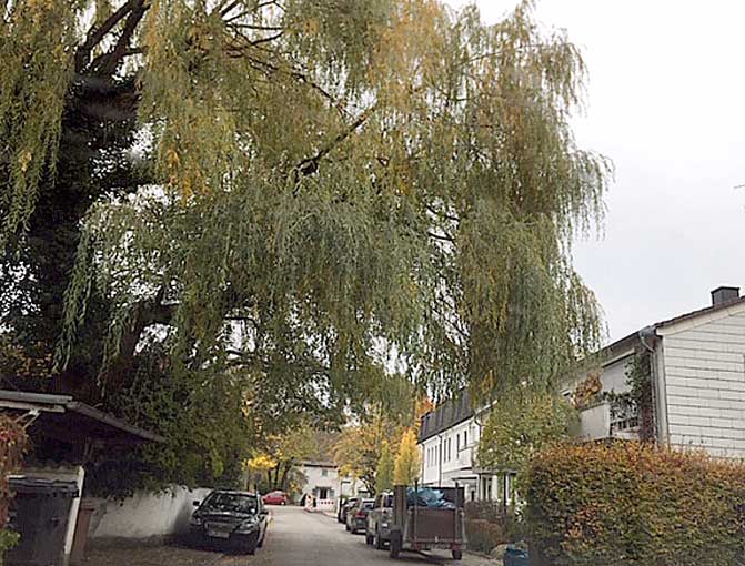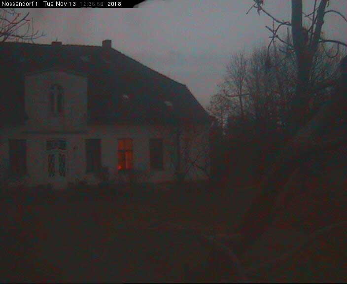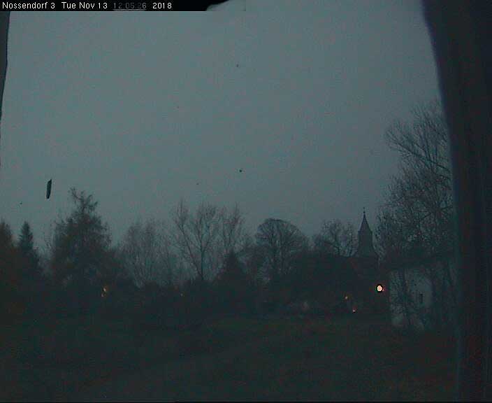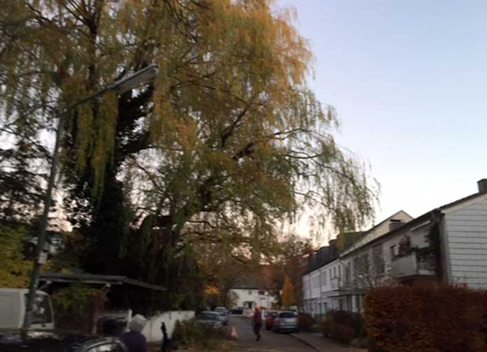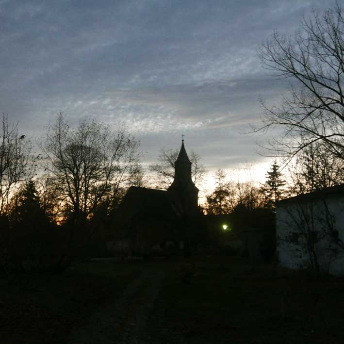 jetzt mit Bäumen ohne Blätter sieht man die Kirche am Abend aus dem Fenster in voller Silhuette gegen über