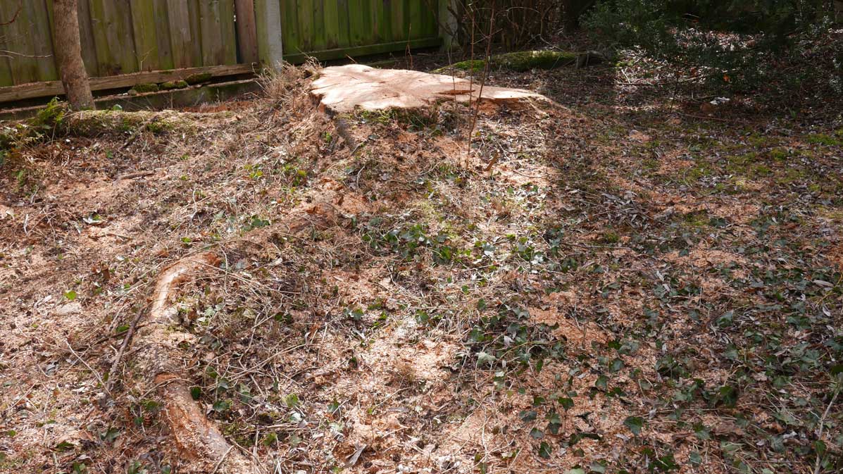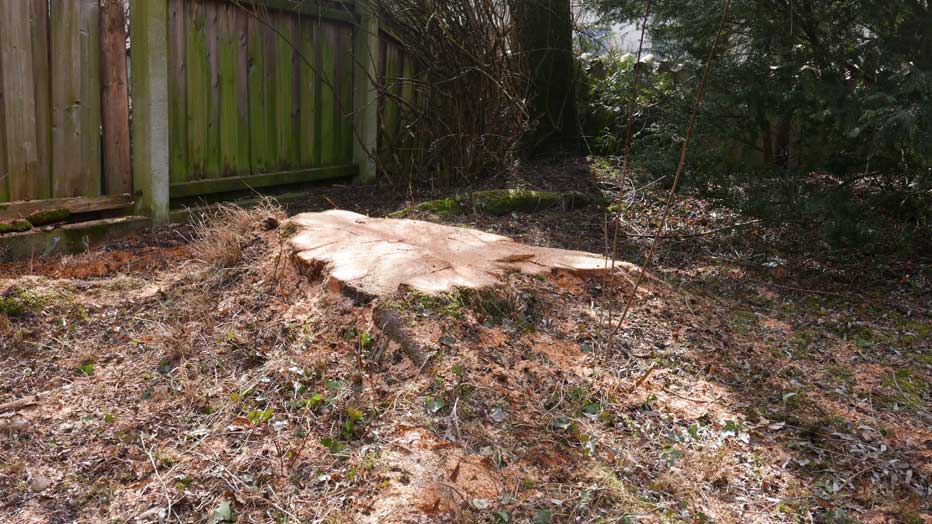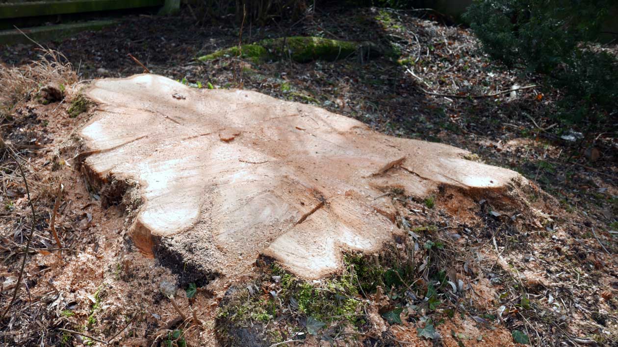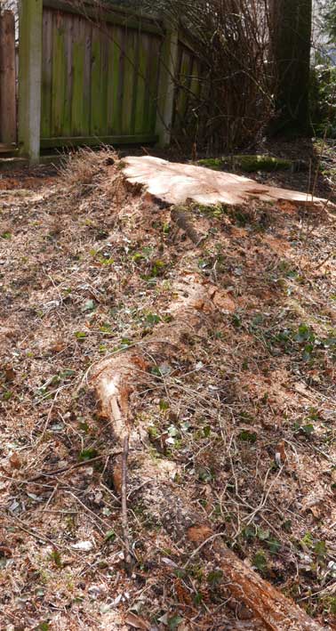 weitausgreifend die Wurzen und nach allen Seiten oben sichtbar, jahrelang verteidigt gegen die Nachbarn bis vor Gericht gegen Eingriffe an der anderen Seite des Zauns mit Efolg, wegen die denkmalwürdigen Gesamtbildes weithin.