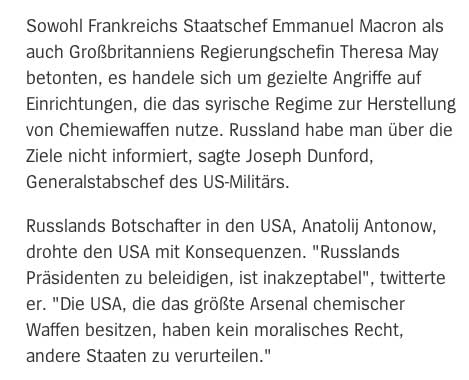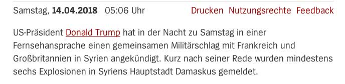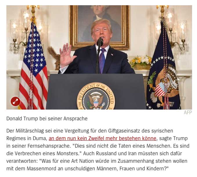 Washington (dpa). Die USA, Frankreich und Großbritannien haben in der Nacht mit Militärschlägen gegen Syrien begonnen. US-Präsident Donald Trump sagte am Abend in Washington, sie seien eine Vergeltung gegen den Einsatz chemischer Waffen durch die syrische Regierung unter Baschar al-Assad gegen das eigene Volk.