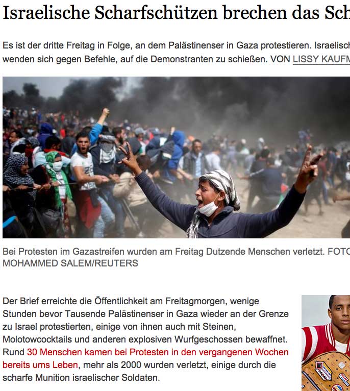 In Israel veröffentlichte die linksliberale Tageszeitung „Haaretz“ den Brief, in Europa waren es „El País“ in Spanien, „De Standaard“ in Belgien und „The Guardian“ in Großbritannien. Es ist ein Brief, der wachrütteln und nachdenklich stimmen soll und der deutlich macht, dass der Einsatz der Armee an der Grenze zum Gazastreifen durchaus kritisch gesehen werden kann. Vor allem dann, wenn ein Bataillonskommandeur wie Chaim Cohen im Armeeradio erklärt, dass auf Anstifter und Protestanführer scharf geschossen werden darf – auch dann, wenn diese nicht bewaffnet sind.